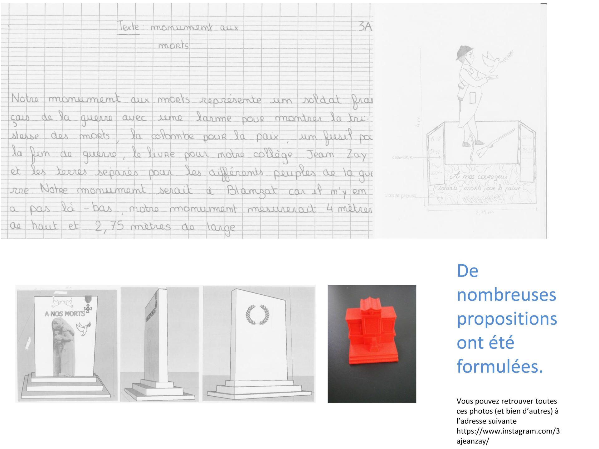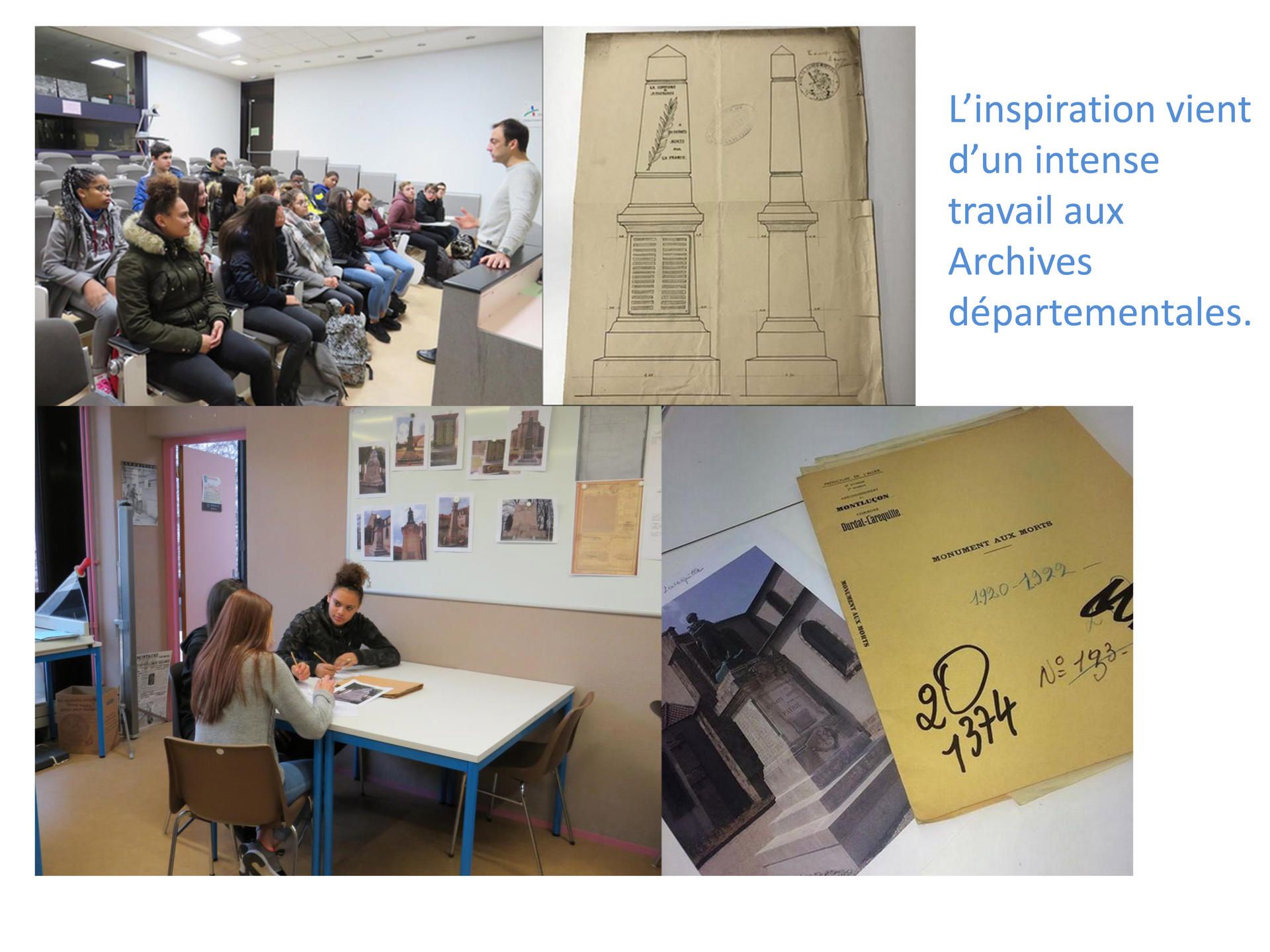 Le projet de réalisation d’un monument historique a fait l’objet d’un Enseignement et Pratiques Interdisciplinaires en histoire et arts plastiques. Il s’inscrit plus largement dans un travail sur l’année autour de la commémoration. Les jeunes ont effectué un voyage de 3 jours à Verdun et Strasbourg où ils ont pu observer différents monuments destinés à l’hommage aux victimes des conflits, civils et militaires (ossuaire de Douaumont, tranchée des baïonnettes, mémorial de Verdun, stèles des villages détruits, Souvenirs des résistants, monuments aux morts, camp du Struthof). De plus, une observation de divers monuments commémoratifs a été effectuée à chaque sortie de manière réelle, et en classe de manière virtuelle. Ainsi les jeunes ont pu dégager les enjeux et caractéristiques d’un monument commémoratif.