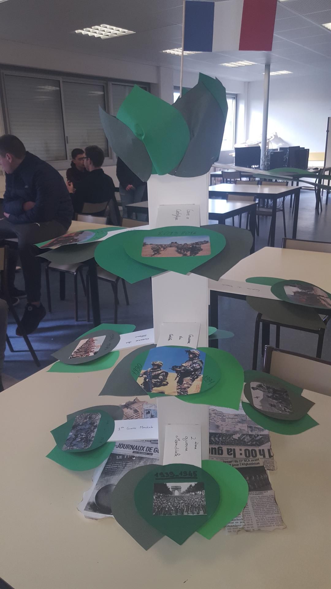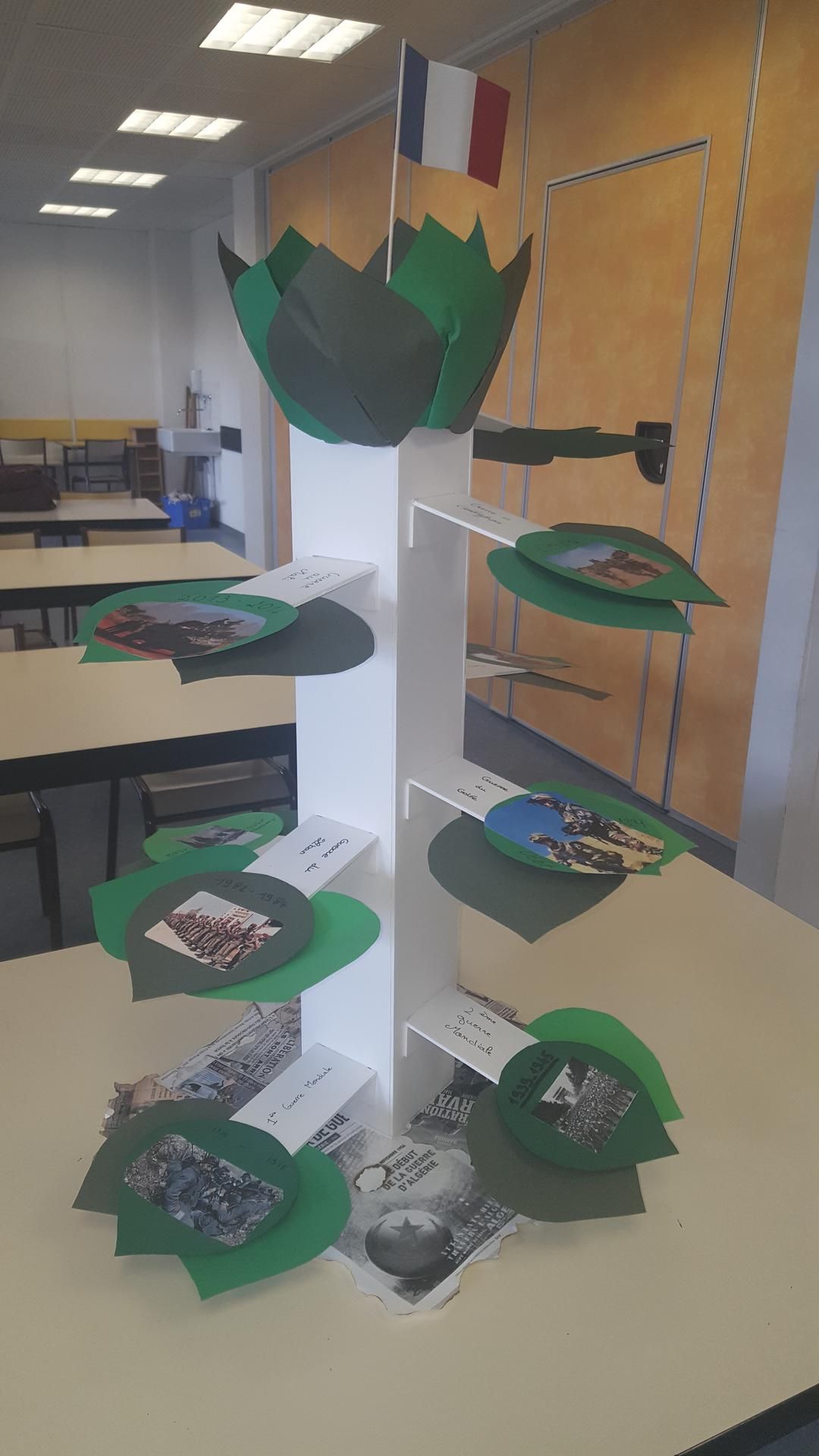 Les élèves constituent la branche qui correspond au conflit qu’ils ont travaillé en l’agrémentant des feuilles et en indiquent les dates et le nom du conflit. Ils préparent ensuite le socle avec les « UNE » qu’ils auront au préalable vieillies.
