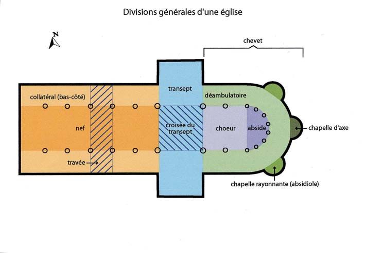 Transept, travées, nef, collatéraux (bas-côtés), chevet, déambulatoire, chapelle d’axe, chapelles rayonnantes, abside, absidioles, croisée du transept, chœur.