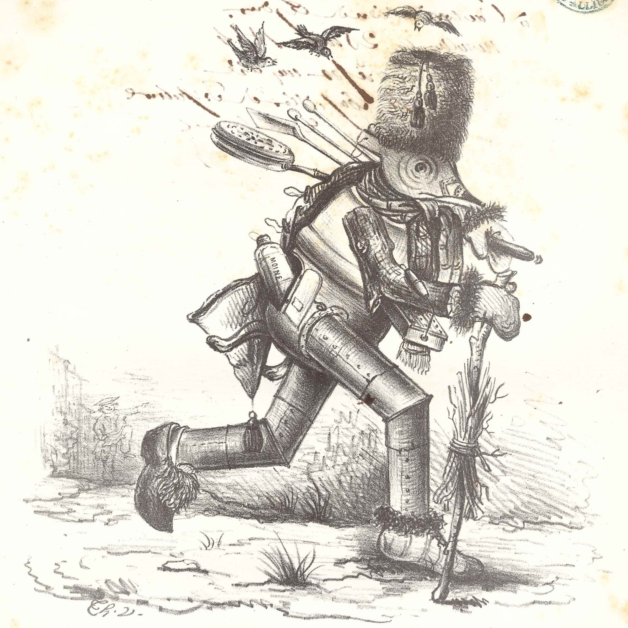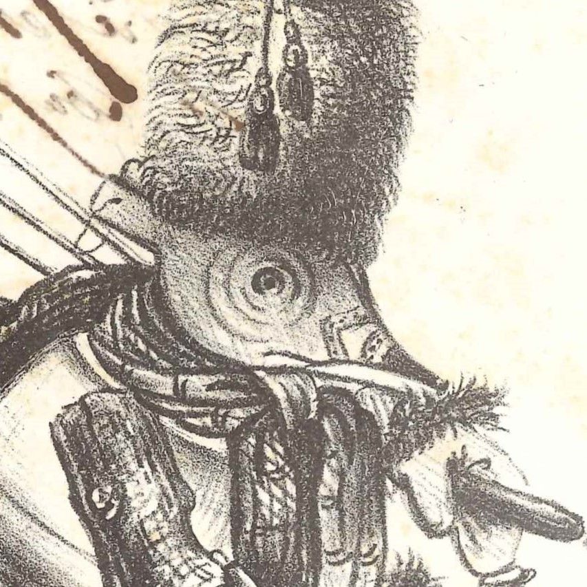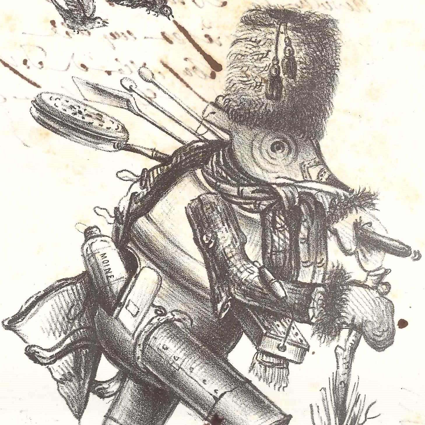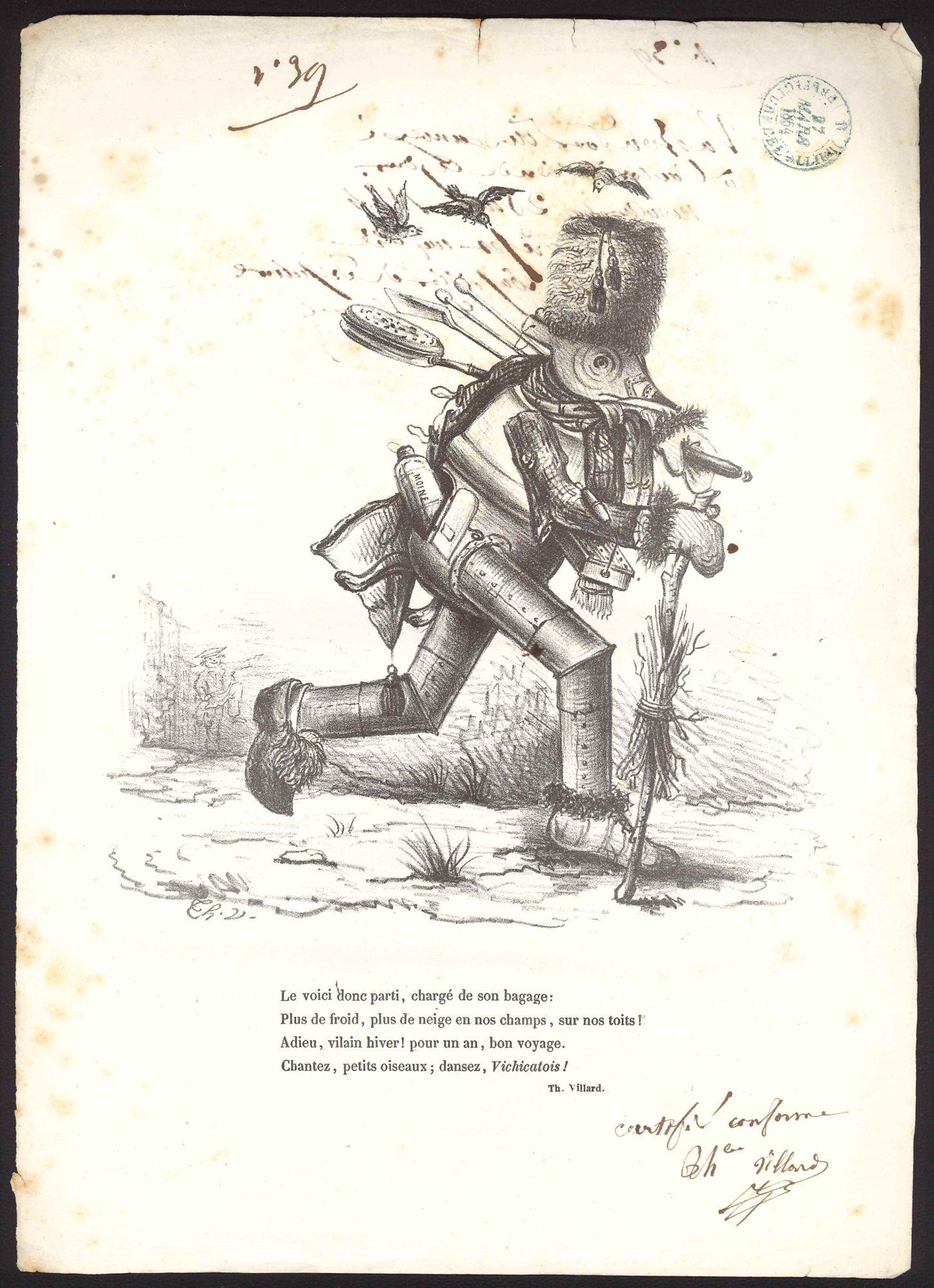 Cette étonnante gravure est issue des fonds de la censure de la Préfecture, conservée sous la cote 2 T 247. Son auteur Théophile Villard l’a soumise à autorisation, le 28 mars 1854 pour pouvoir la publier dans L’Hebdomadaire de Cusset.