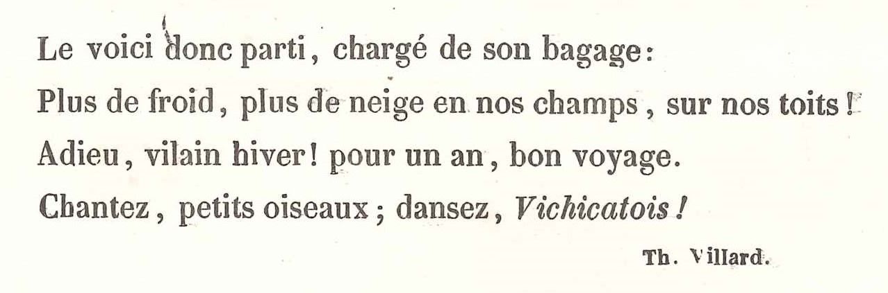 Pour marquer la fin de l’hiver, un personnage composé de tuyaux de poêle s’enfuit en courant. Sa tête est faite d’un soufflet, coiffé d’un bonnet à poils. Ses outils sont une bassinoire, une chaufferette et des pique feu. Bonnet de nuit, Un bâton