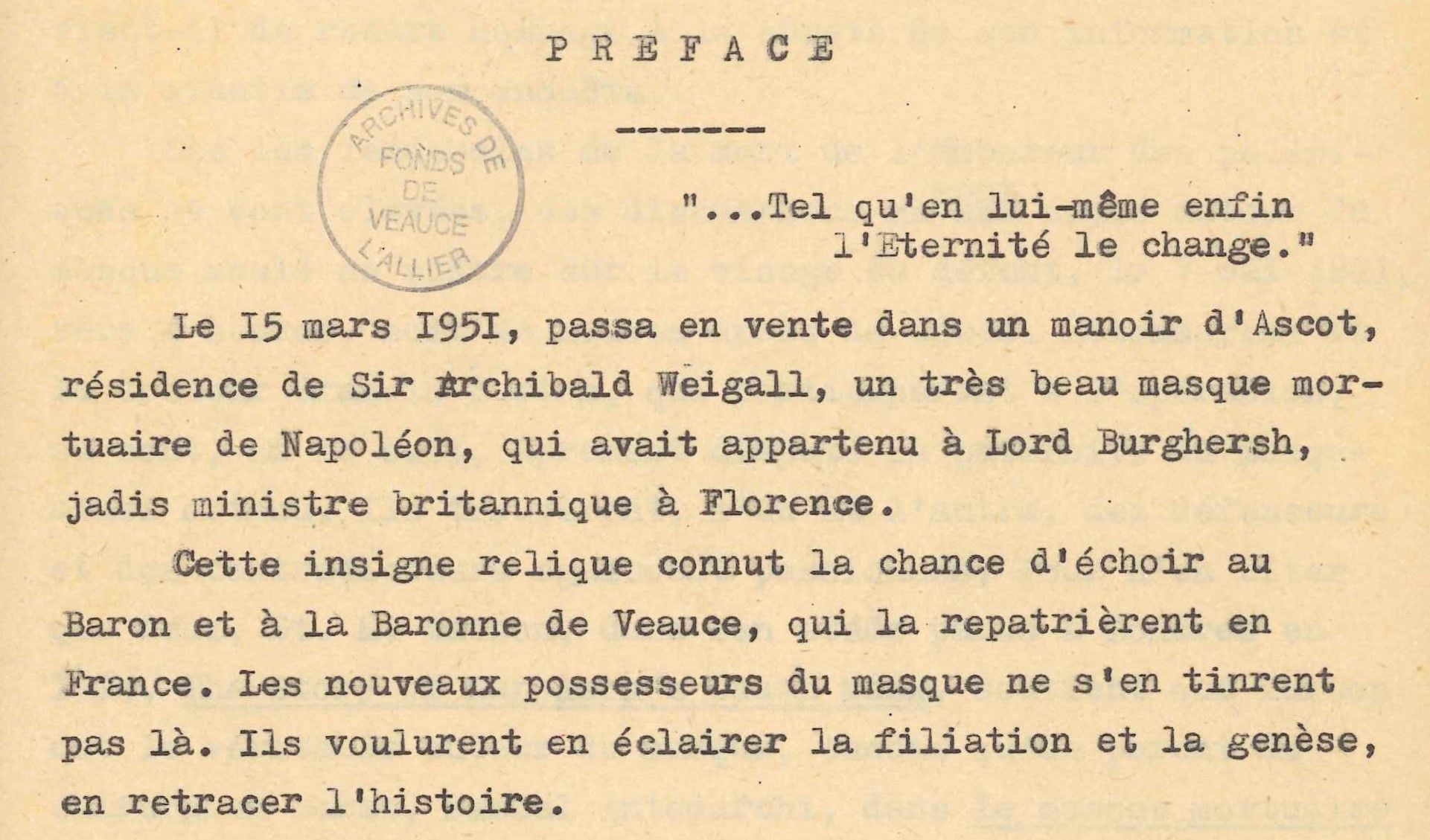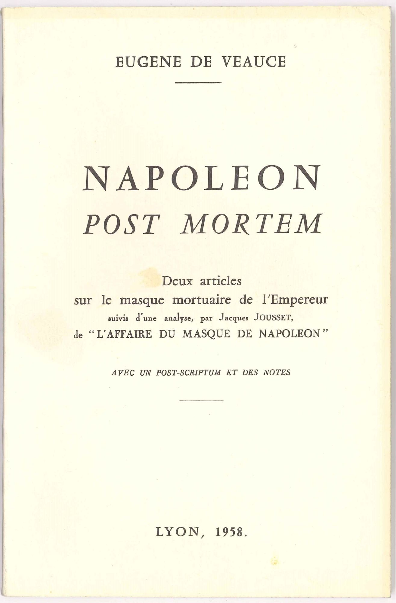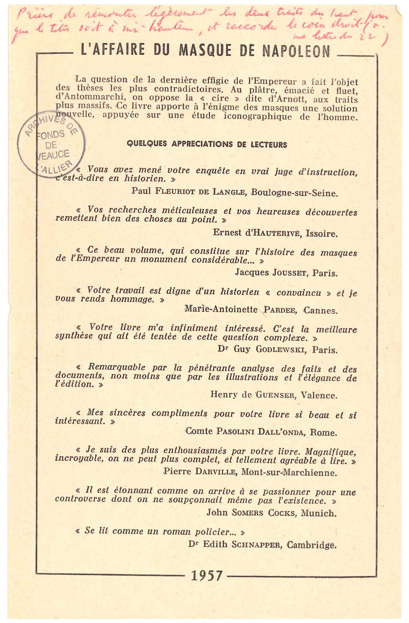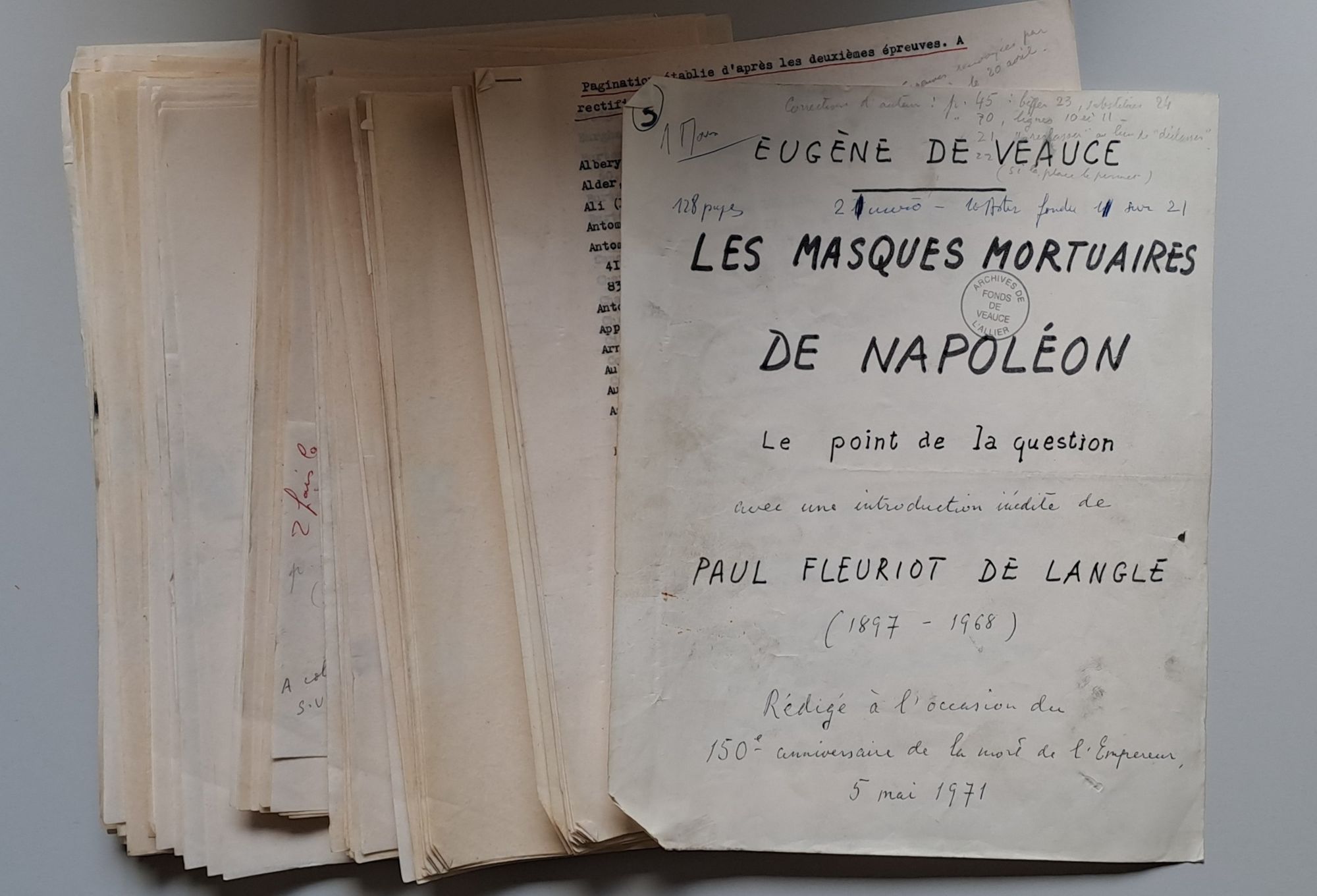 Epreuves, manuscrits, photographies et pièces diverses relatifs à l’ouvrage du baron Eugène de Veauce sur L’affaire du masque de Napoléon.