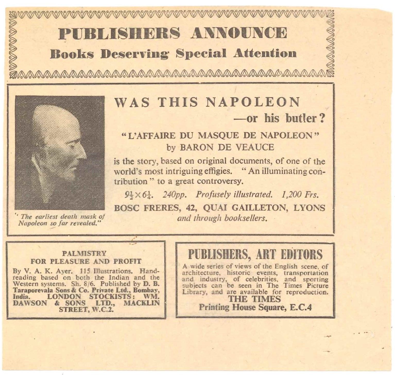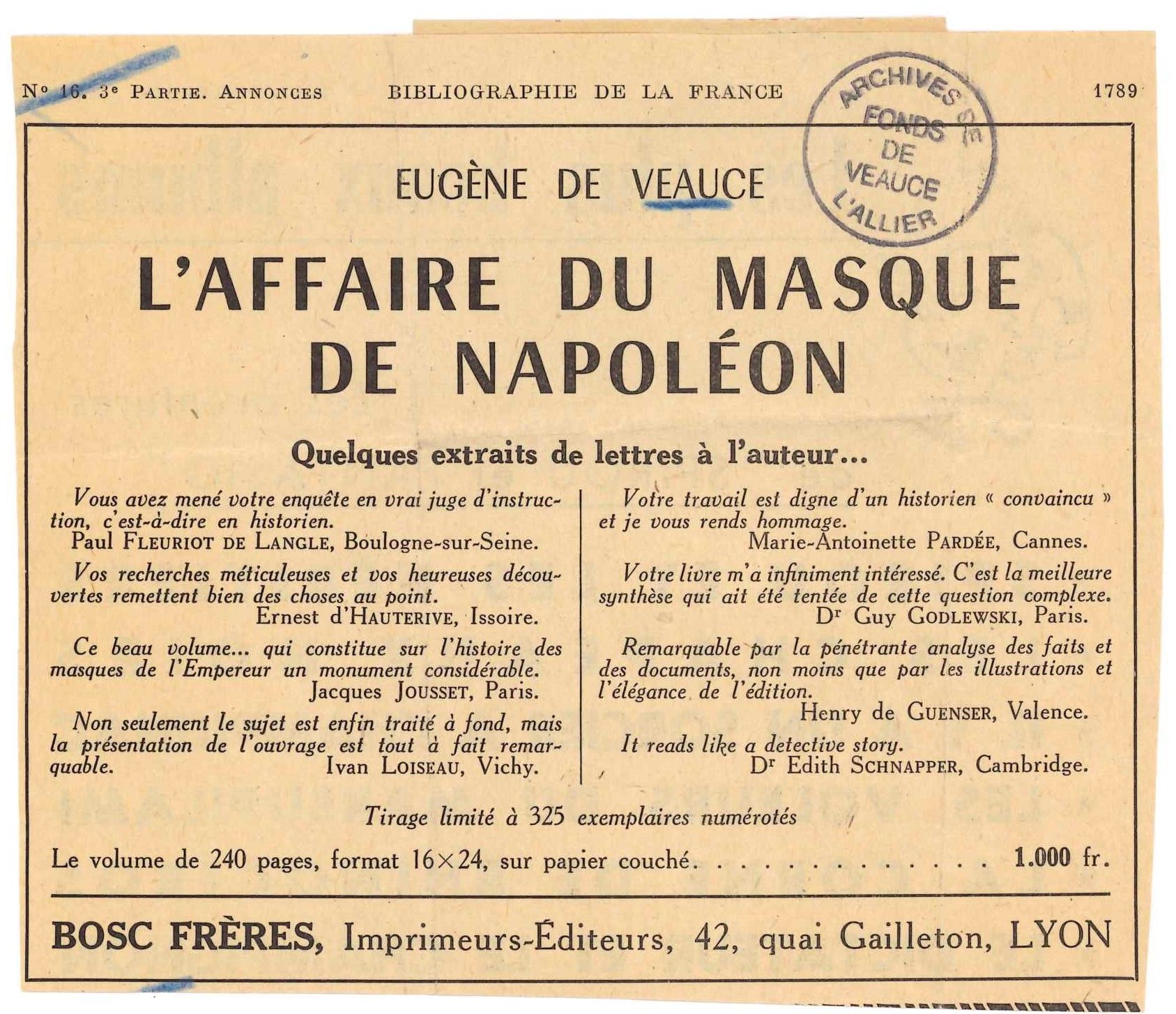 Publication et vente des ouvrages du baron Eugène de Veauce sur les masques mortuaires de Napoléon : annonces, publicités, coupures de journaux, correspondance.