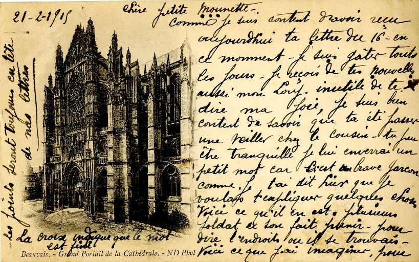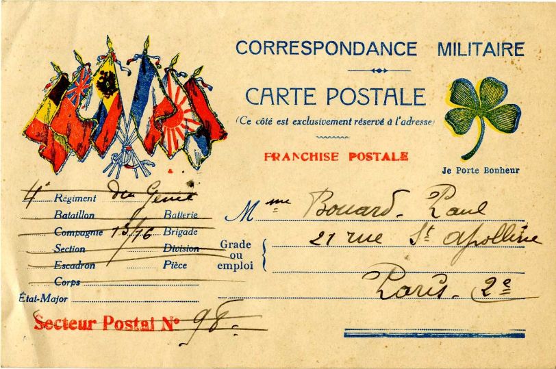 Paul Bouard entretient une correspondance soutenue avec sa femme, il lui écrit une à deux lettres par jour. A travers elles, on peut sentir l’exacerbation de leur sentiment, provoquée par leur séparation. Le besoin de tenir sa femme informée est très fort. Il tente de détourner la censure en inventant un stratagème sous forme de code pour indiquer son emplacement au cours de ses déplacements. Ainsi dans sa lettre du 21 février 1915, il lui explique son système : « je te ferais un gros points sous chacun lettre du pays ou je me trouverai ». Par exemple, dans sa lettre du 28 février 1916, il lui révèle ainsi qu’il est à Verdun. Il lui envoie par ailleurs des coupures de journaux pour la tenir au courant des actualités du front et de l’arrière avant qu’elle ne retourne à Paris voir lettre du 24 mars 1915. Il lui transmet également des souvenirs sous la forme de fleurs (voir), de plumes de faisan (voir) ou de morceaux d’un ballon de dirigeable allemand abattu (voir).