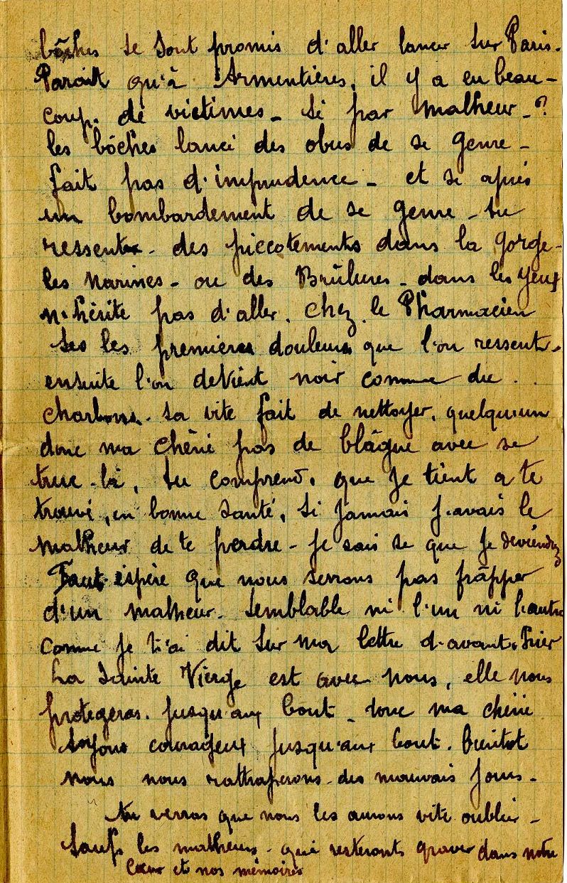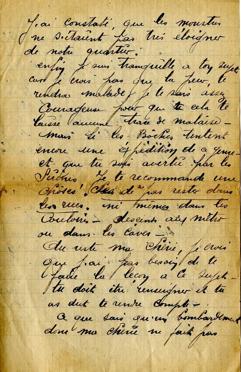 Du fait des bombardements de Paris, il est plus inquiet pour la sécurité de sa femme que pour la sienne. Il lui donne des conseils notamment pour se protéger des gaz toxiques (voir lettre du 23 août 1917) ou pour se mettre à l’abri lors des bombardements (voir lettre du 2 février1918).
