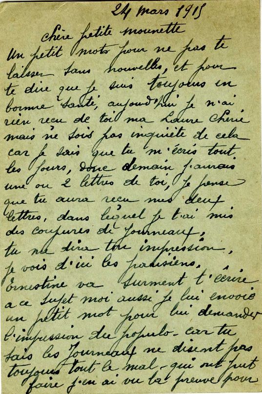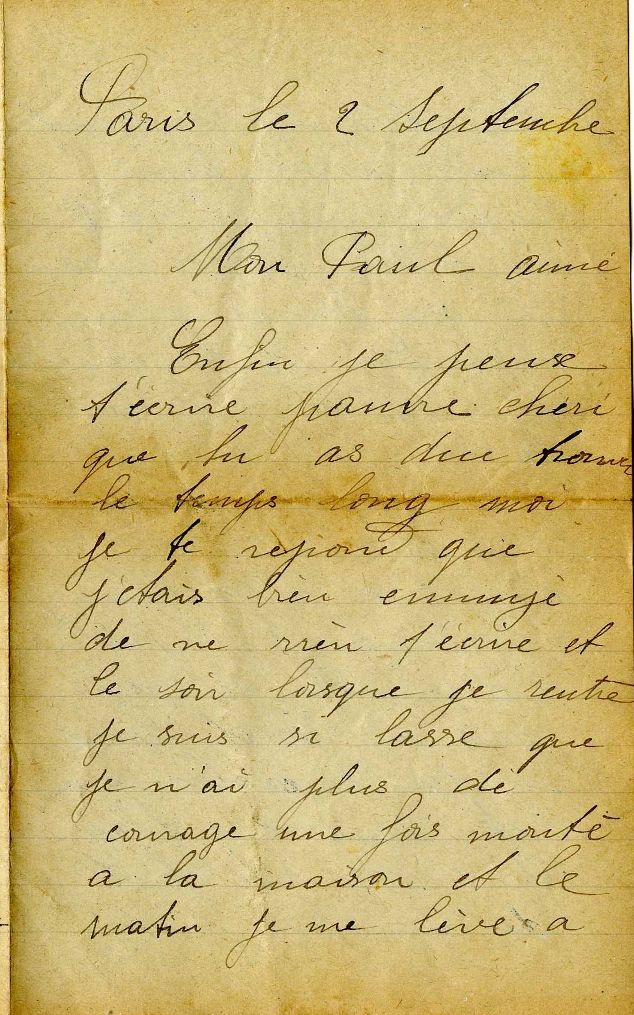 La préoccupation du bien-être de sa femme est omniprésente dans sa correspondance. Ce souci est encore plus marqué à partir de 1916, lorsqu’elle trouve du travail dans une brasserie à Paris. Paul s’inquiète alors beaucoup de sa santé, elle lui explique d’ailleurs dans sa lettre du 2 septembre 1916, qu’elle est trop fatiguée pour lui écrire le soir après son travail.