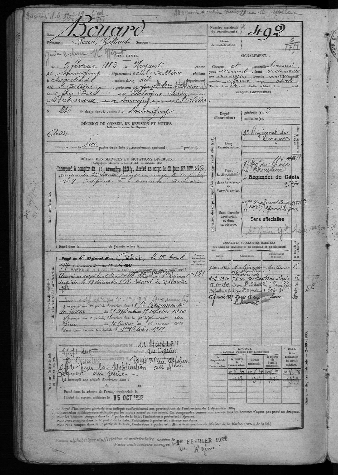 Paul Bouard est né le 2 février 1883 à Noyant-d’Allier et est décédé le 21 décembre 1935 à Neuilly sur Seine à l’âge de 52 ans. Il s’est marié le 20 septembre 1910 avec Laure Damestoy à Paris. Avant d’être mobilisé le 4 août 1914 (voir son registre matricule ), il est employé à la Taverne du Nègre à Paris. Durant toute la période de guerre, il occupe un poste de cuisinier et n’est donc pas envoyé directement sur le front. Il est évacué le 31 Décembre 1918.
