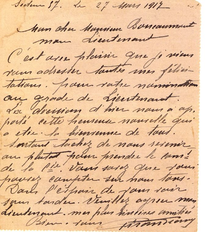 En 1916 il retrouve son grade de Sous-Lieutenant et en 1917 il est promu Lieutenant dans l’Infanterie territoriale pour la durée de la guerre, par décret du Président de la République du 18 mars 1917. Il reçoit à cette occasion une chaleureuse lettre de félicitations de la part de ses hommes.