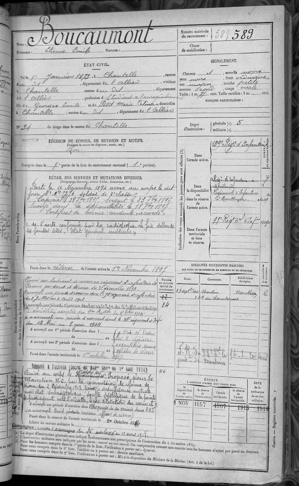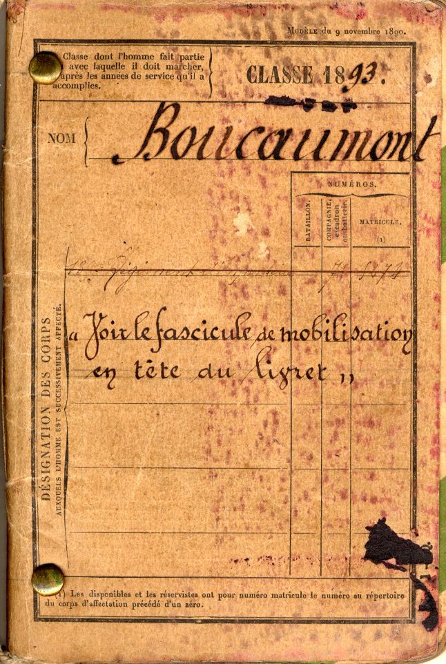 Etienne Boucaumont, de Chantelle, a 22 ans lorsque la guerre éclate. Après son bac « ès sciences » (voir son livret militaire), il se lance dans les études pour travailler à l’administration de l’Enregistrement Ce niveau d’instruction supérieur à la moyenne- niveau 5, le maximum, sur son registre matricule - lui vaut d’obtenir les grades successifs de caporal en 1895 puis sergent en 1896 durant son service militaire.