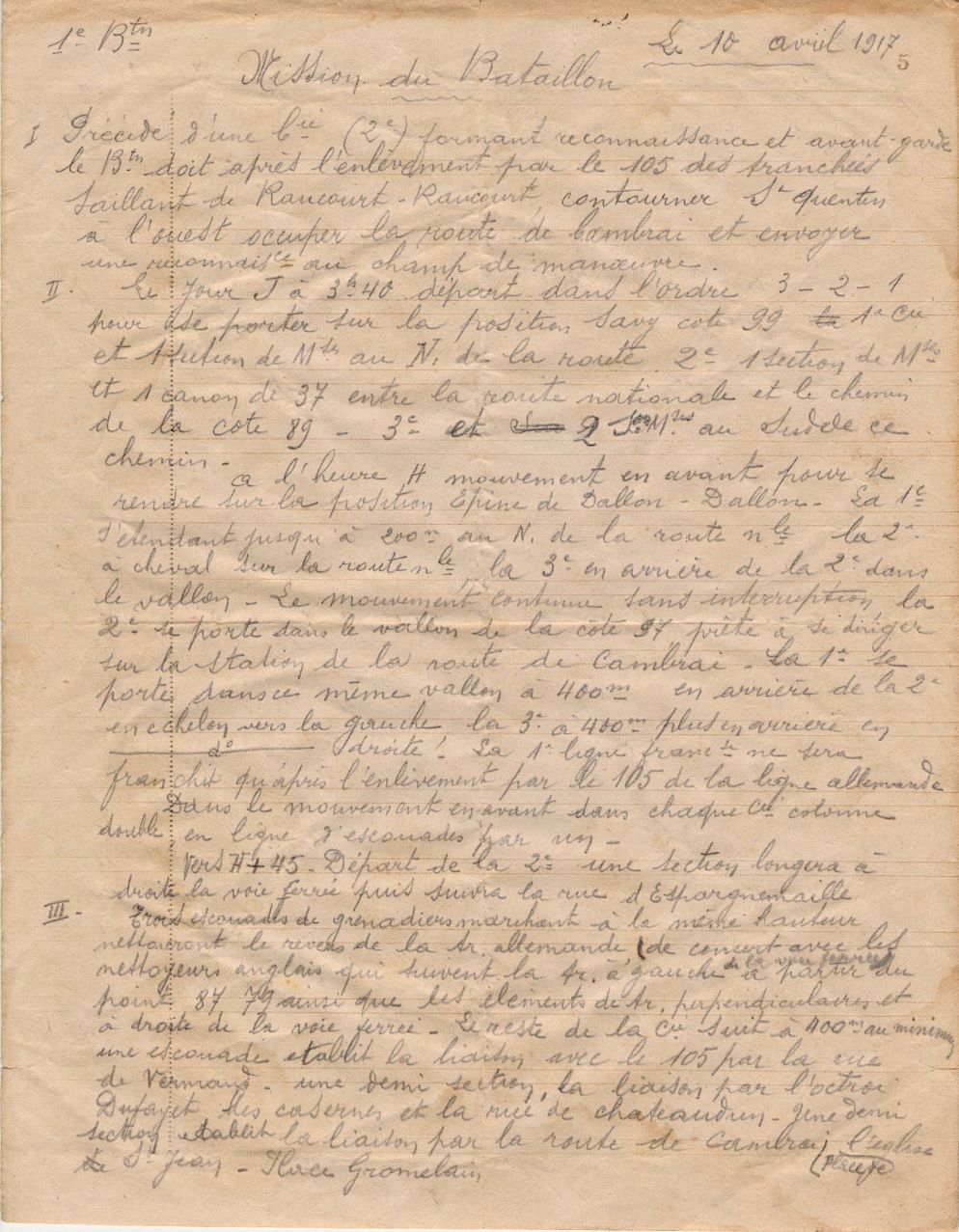 Le nouveau lieutenant élabore des feuilles de route pour les missions que doit accomplir son bataillon comme ce 10 avril 1917 : « (…)le jour J à 3h40 départ dans l’ordre 3-2-1 (…) » (voir)