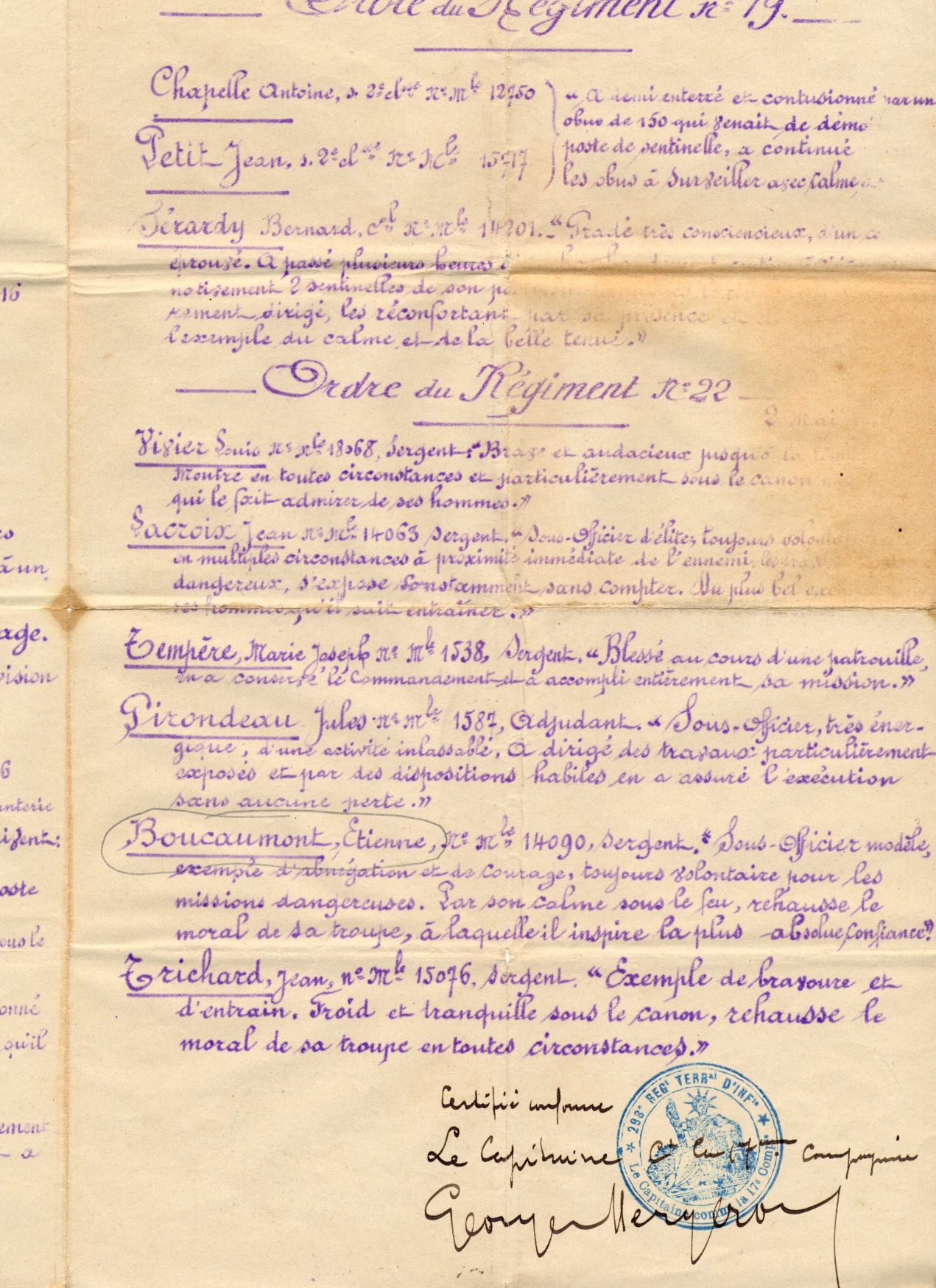 Cité à l’ordre de son régiment le 2 mai 1916 : « sous-officier modèle, exemple d’abnégation et de courage, toujours volontaire pour les missions dangereuses. Par son calme sous le feu, rehausse le moral de sa troupe, à laquelle il inspire la plus absolue confiance » (voir citation).