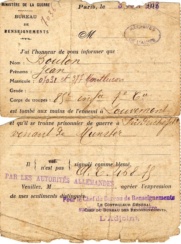 BOULON Jean, de Saint-Rémy-en-Rollat Saint-Rémy-en-Rollat Archives de Jean Boulon en format pdf Photo de groupe avec Jean Boulon (404.6 Ko) livret militaire de Jean Boulon (1.4 Mo) La famille de Jean Boulon est avisée de son statut de prisonnier de guerre (1.3 Mo) Registre matricule de Jean Boulon Accès rapide Histoire du Bourbonnais 1914-1918 Sceaux et cachets #AllierJeudiArchives Nous contacter