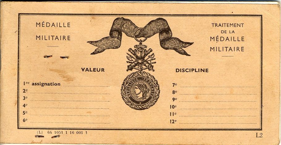 Il reçoit la croix de guerre et la médaille militaire par décret du mars 1932. A cette décoration est rattachée une pension annuelle de 15 francs. (voir les coupons de 1964 à 1972)