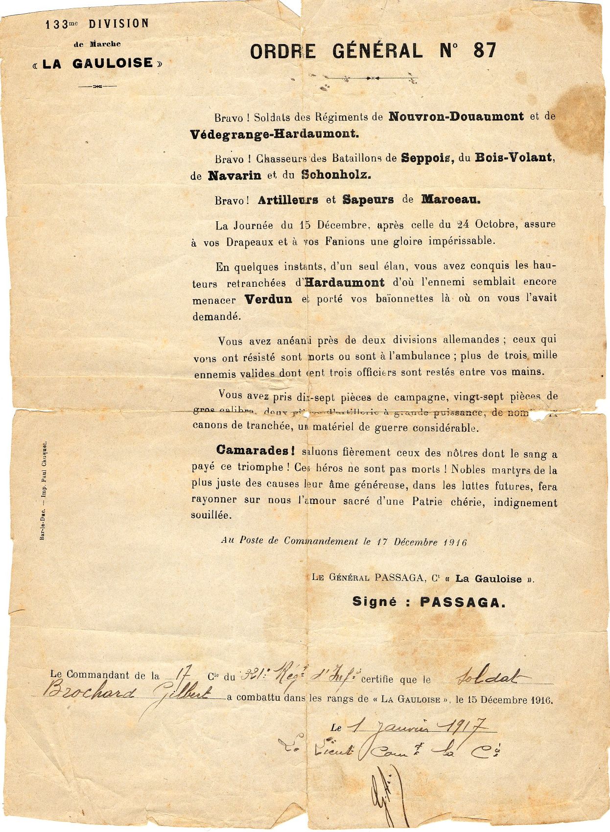 Il tient un carnet de route dans lequel il consigne les dates et lieux où il passe. Les combats auxquels il participe sont décrits de manière très lapidaire. Ainsi parmi les grandes offensives de Verdun, celle du 24 octobre 1916 pour la reprise du fort de Douaumont perdu en février de siège : « le 24 à onze heures 50 on participe à l’attaque du fort de Douaumont. L’attaque a réussit et nous avons été relevé le 29 au matin ». Même sobriété pour l’attaque de Bézonvaux le 15 décembre 1916 : « le 15 à dix heures du matin on participe à l’attaque de Bézonvaux et là on a eut des difficultés et des pertes mais l’on est parvenu à atteindre l’objectif qui nous était indiqué ». La bravoure des soldats ayant participé à ces deux offensives est saluée par le général Passaga, commandant de la 133eme division de marche, dite « La Gauloise » dans son ordre général n° 87.