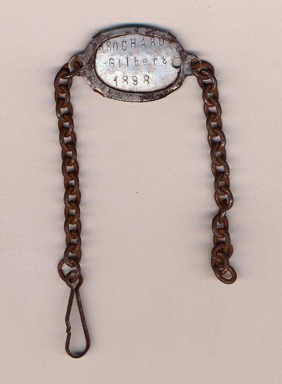 Cultivateur originaire de Venas, Gilbert Brochard, de la classe 1898 est âgé de 36 ans lorsque la guerre éclate en 1914. Il est marié à Marie et est le père de deux enfants Lucien et Marie-Victorine (voir photo de famille). Muni de sa plaque d’identité militaire signalant sur une face son nom, prénom et classe et sur l’autre son bureau de recrutement (Montluçon) et son n° matricule au recrutement (n°1229). Il est affecté au 98e Régiment d’Infanterie de l’armée territoriale. Il est cité deux fois à l’ordre de son régiment : le 28 juin 1916 et le 5 novembre 1916. La première fois, il est loué pour son « grand calme et sang-froid » en tant qu’agent de liaison. La seconde on lui reconnaît « beaucoup d’entrain » et « beaucoup de courage ». On retrouve son parcours militaire dans son registre matricule et son fascicule de mobilisation.