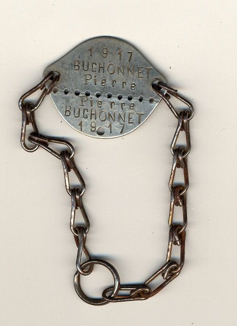Pierre Buchonnet, habitant de Toulon-sur-Allier, est incorporé le 26 août 1916 (voir son registre matricule ), il n'a pas 20 ans. Il rejoint un bataillon de chasseurs à pied. Il assure la difficile mission de brancardier en septembre 1918, ce qui lui vaut une citation à l'ordre de son régiment : "chasseur brave et d'un déouement exemplaire". Il est hospitalisé fin 1918 après une attaque au gaz ypérite dans les Ardennes. Il sera pris en charge après la guerre pour ces problèmes pulmonaires ("sclérose légère du sommet gauche") au titre de la loi du 31 mars 1919 sur les soins gratuits assurés aux anciens combattants. Il travaille comme télégraphiste dans l'administration militaire puis aux PTT. Il sera décoré d'une croix de guerre avec 2 étoiles de bronze.