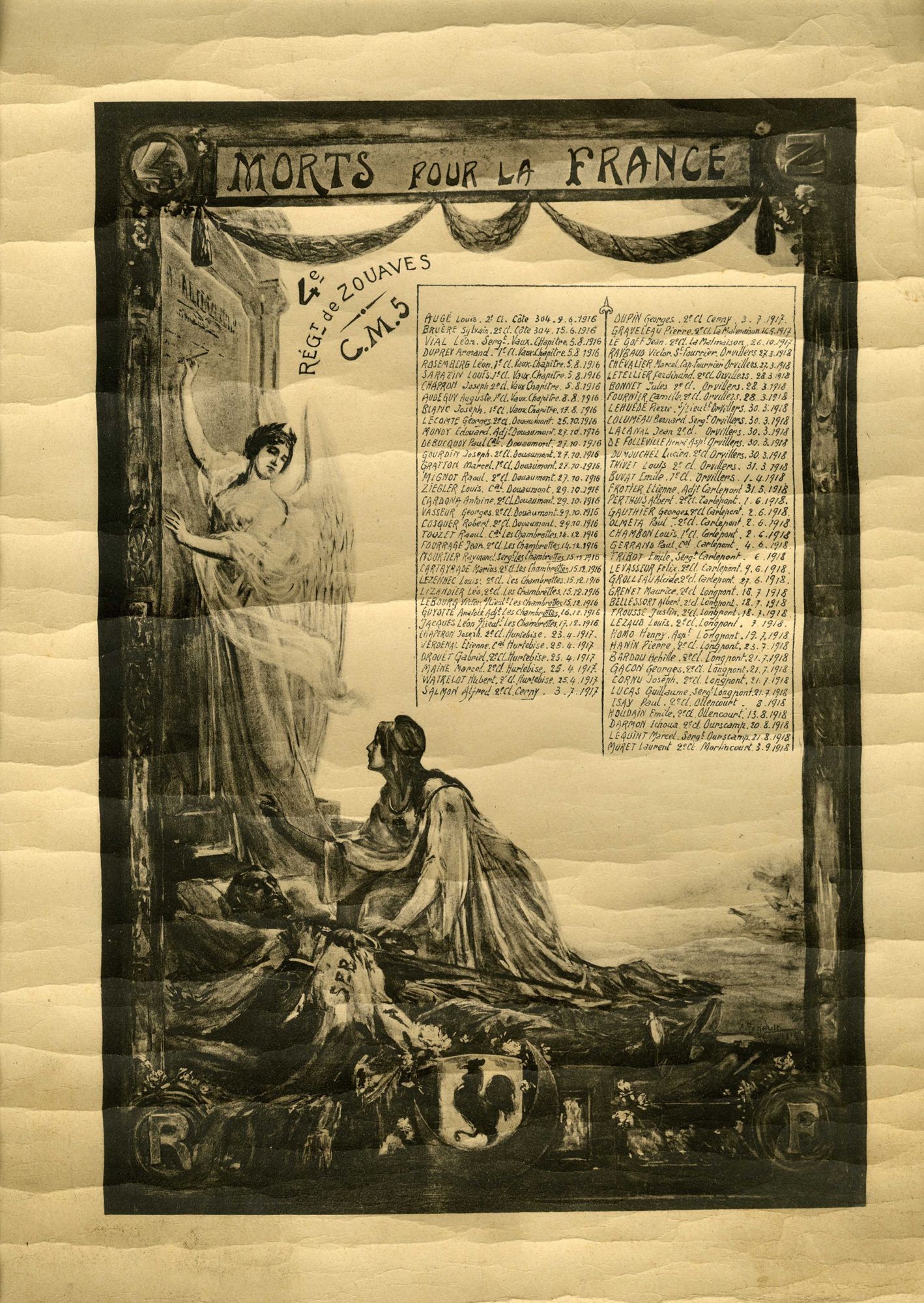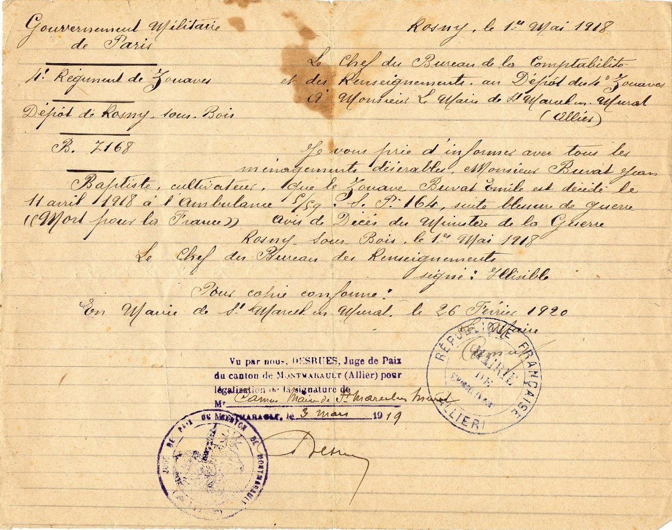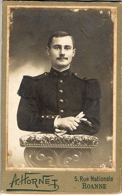 Emile Buvat, l’aîné des deux frères, est incorporé dans un régiment de zouaves le 16 décembre 1914 (voir son registre matricule ). Il est envoyé sur le front d’Orient à Salonique (voir sa carte du 28 octobre 1914). Il bénéficie d’une permission agricole à Limonest (Rhône) durant fin juin-débit juillet 191. Il voit cela comme un répit aux combats : « c’est toujours autant de tirer » (voir ses cartes de l’été 1917)). De retour au front, il est mortellement blessé le 11 avril 1918 (voir avis de décès) et décède à l’ambulance à Compiègne (voir la liste des morts de son régiment de Zouaves)