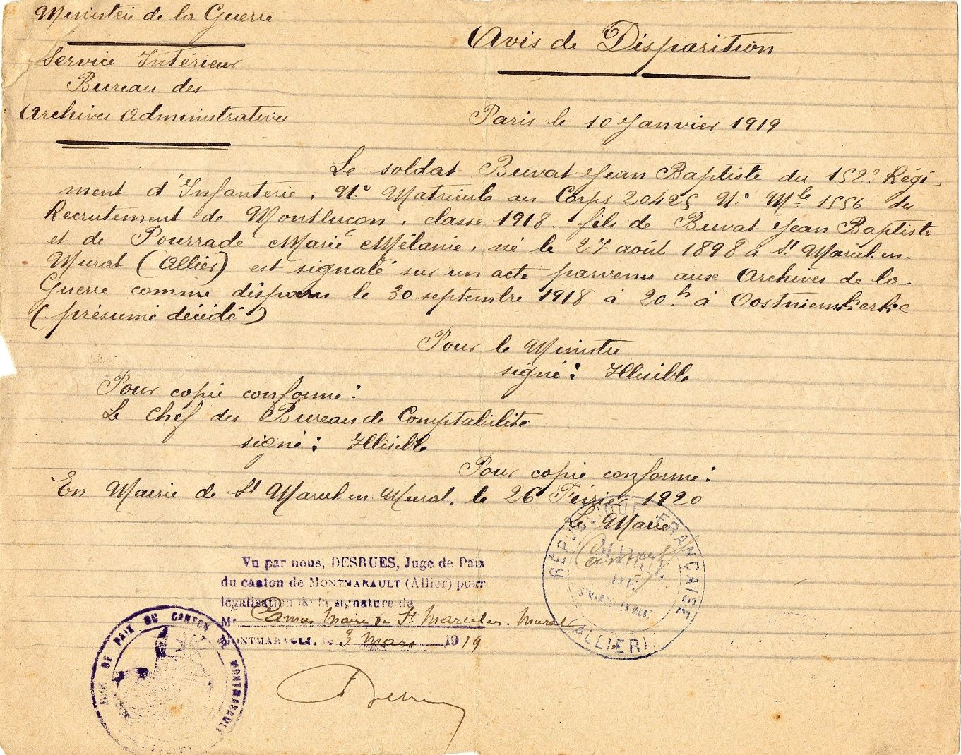 Son cadet, Jean-Baptiste/Armand est incorporé à l’âge de 19 ans le 2 mai 1917 (voir registre matricule). Il est porté disparu à Oostnieuwkerke (Belgique) le 30 septembre 1918 (voir avis de disparition). Le 13 novembre 1919, le service comptabilité du 152e régiment d’infanterie dont faisait partie Armand de Colmar envoie un chèque de 150 francs (voir) aux parents Buvat au titre de « secours » suite à la disparition de leur fils. Le 7 octobre 1921, le tribunal de Montluçon le déclare officiellement décédé le jour de sa disparition.