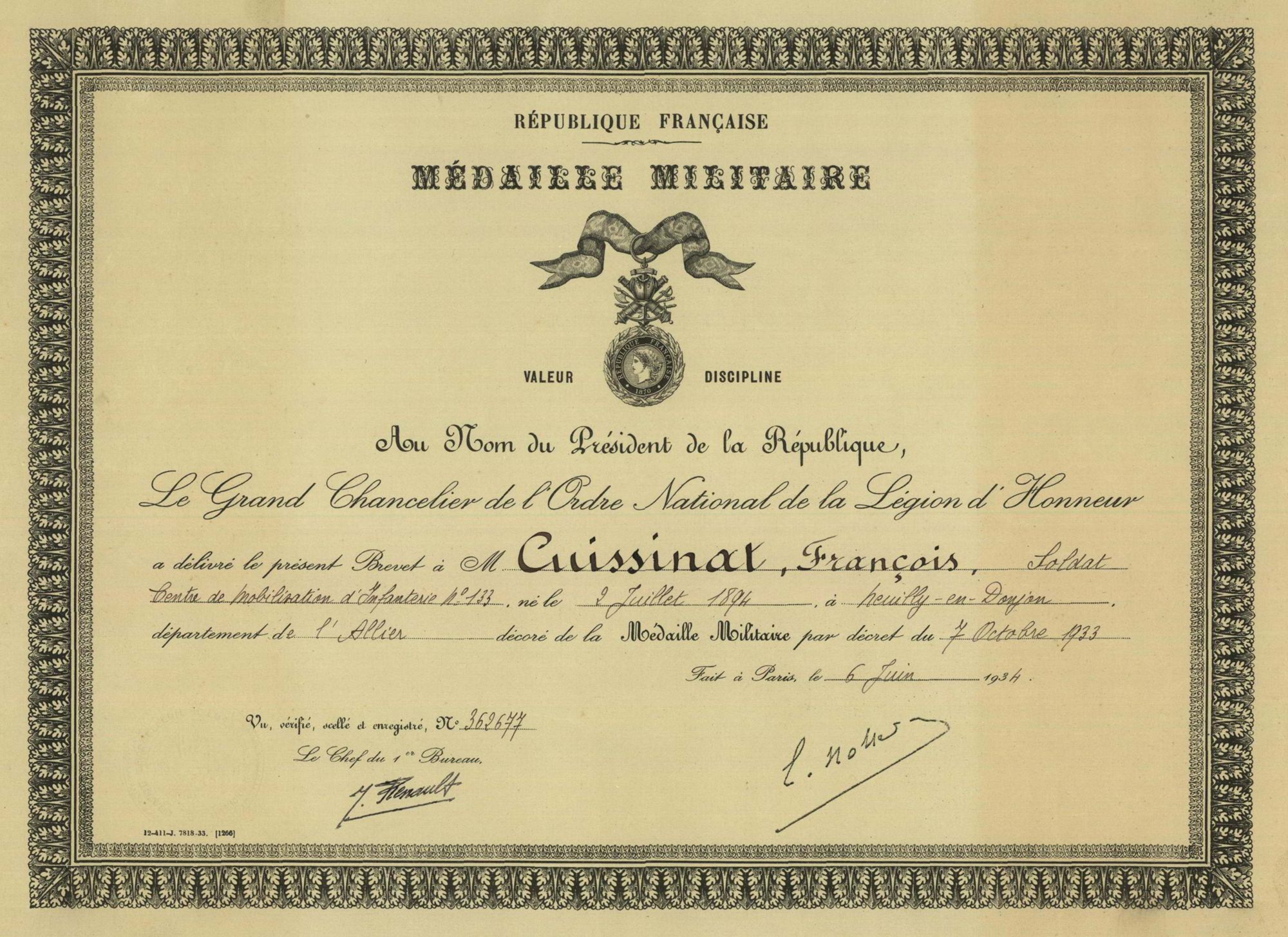 Il est cité à l’ordre de son régiment le 18/10/1918 : « Pendant les combats du 26 au 30 septembre 1918 a exécuté la relève des blessés, immédiatement derrière les vagues d’assaut avec un mépris complet du feu des mitrailleuses ennemies ». C’est probablement ce qui lui vaut la médaille militaire en 1933 (voir son diplôme).