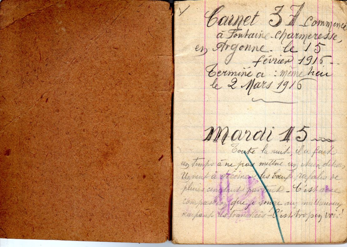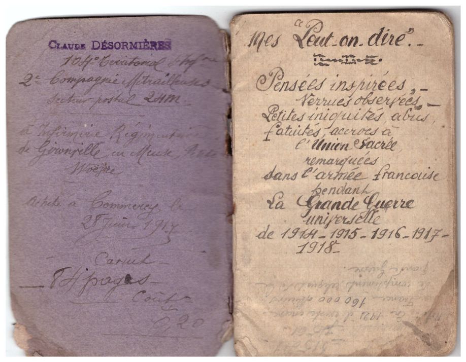 Tout au long du conflit, Claude Désormières a tenu son journal de bord sur plusieurs carnets (voir l’intégralité des carnets). Il y décrit avec minutie chaque journée avec pour fil directeur le récit des offensives auxquelles il a assisté comme celles des 16 et 17 février ou celle du 13 mars 1915. Il commente les combats acharnés ce 23 août 1915: « le duo des gros joujoux de Krupp et du Creusot reprend sur nos deux flânes, ils se répondent par de gros morceaux, et des sujets frappants bien sur avions ». (carnet n°20). Les activités quotidiennes des Poilus sur le front sont égrenées : corvées et loisirs (voir étude détaillée), prix des denrées (carnet 4, 12 février 1915) ou la vie en communauté (carnet 3, 8 janvier 1915). Les conditions de vie dans les tranchées sont désastreuses « D’énormes rats pullulent le long du ruisseau et y font une vie de tous les diables, Genest dans son trou se bat avec eux à coups de bâton. » (carnet n°9, jeudi 1er avril 1915).