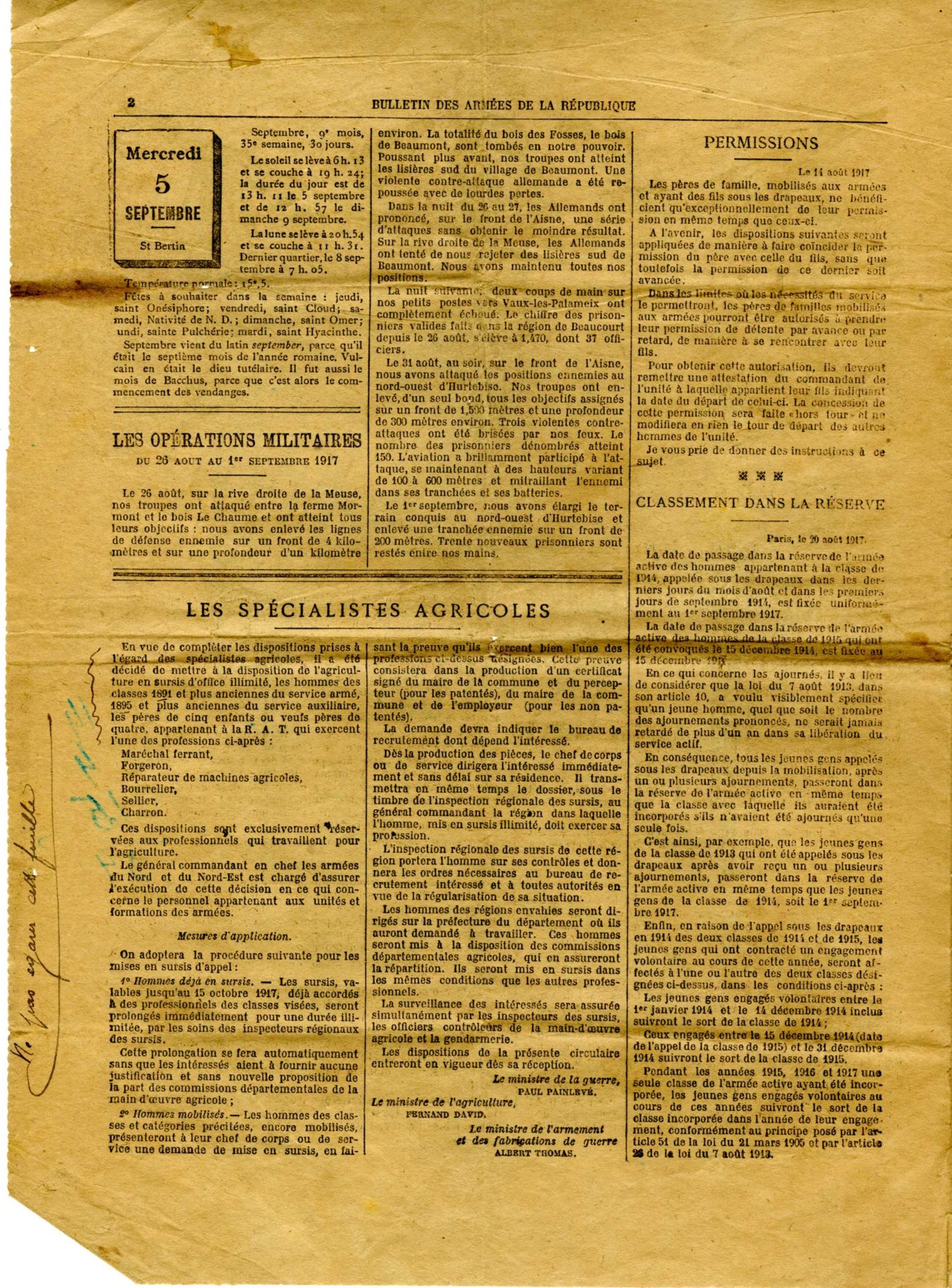 L’aîné, Mathieu, est versé dans l’artillerie où il manie les canons (voir son registre matricule ). Tout au long de la guerre il écrit à ses parents (voir toute sa correspondance) pour les rassurer avant tout, indiquant qu’il est en bonne santé (voir sa carte postale du 27 septembre 1916 ) et qu’il a bien reçu les colis de nourriture (voir sa lettre du 7 septembre 1916). Comme ses camarades, il attend longtemps les permissions et il vit mal le retour de ces dernières (voir sa lettre du 11 novembre 1916). Il se plaint régulièrement des retards du courrier et sa joie est d’autant plus grande quand plusieurs lettres arrivent en même temps (voir sa lettre du 21 décembre 1916). Il bénéficie en février 1919 d’un sursis au titre des dispositions prises à l’égard des « spécialistes agricoles » mettant certains métiers comme celui de maréchal-ferrand à disposition de l’agriculture (voir le Bulletin des armées de la République du 5 septembre 1917). Il est officiellement démobilisé le 20 août 1919.