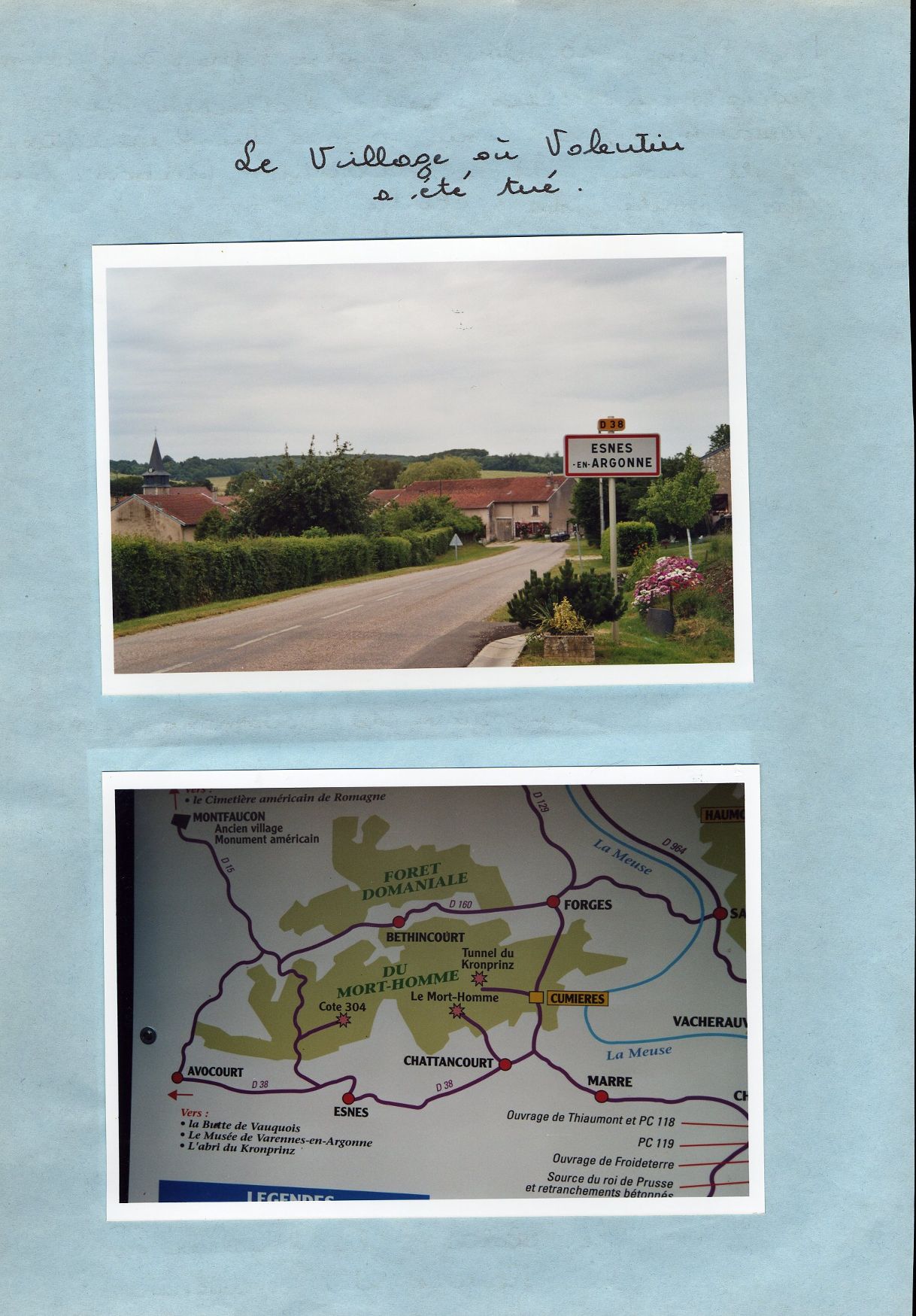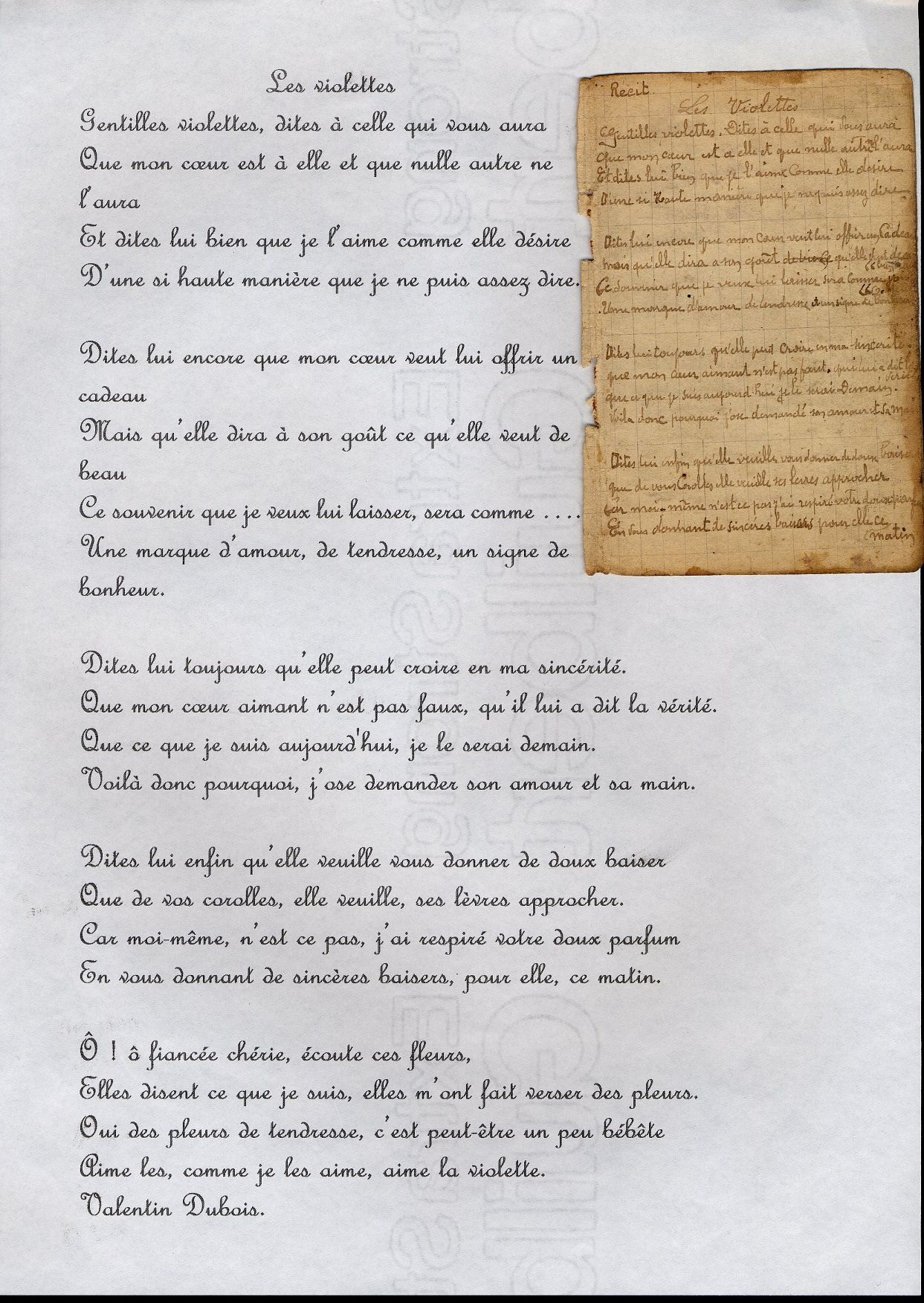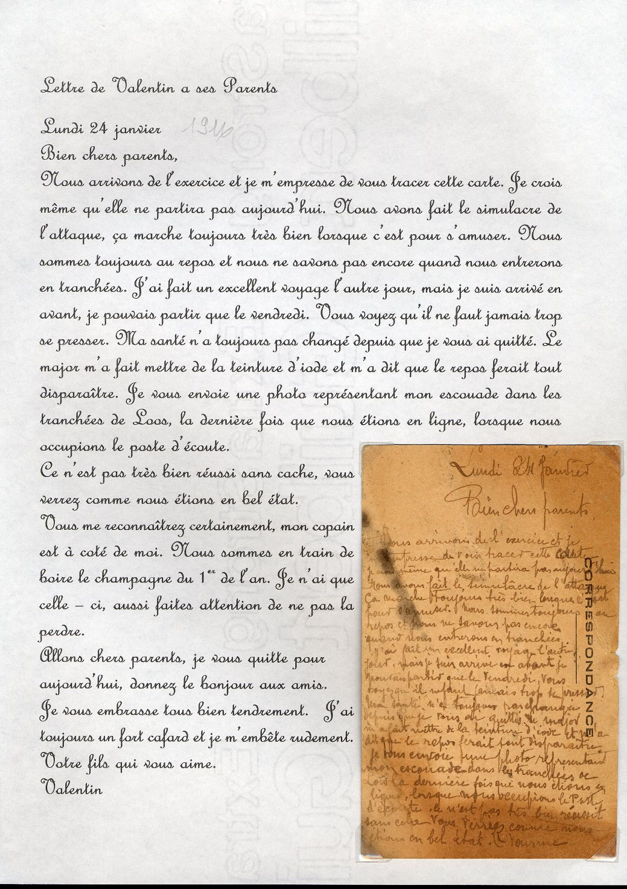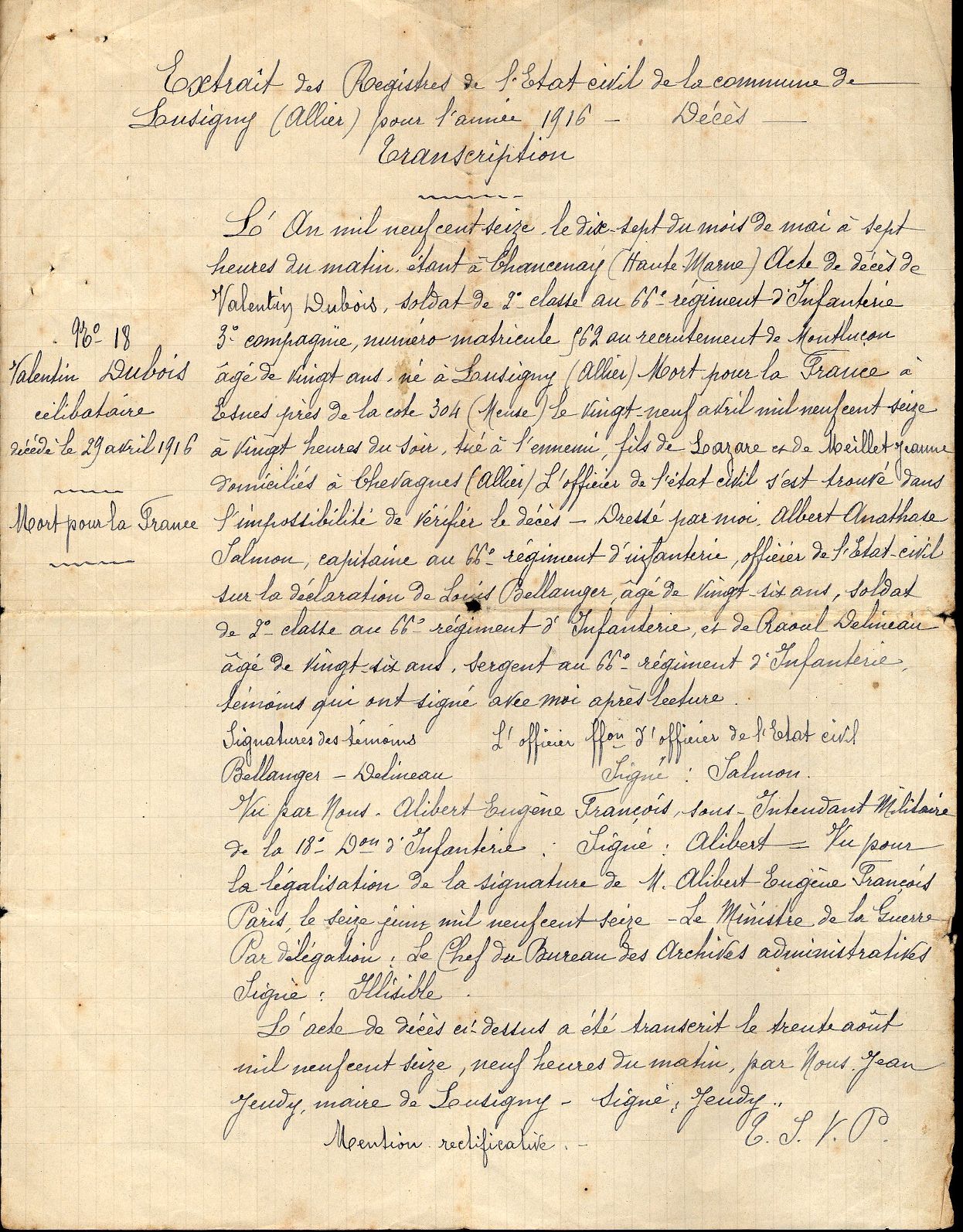 Valentin est quant à lui versé dans l’infanterie (voir son registre matricule ). Comme son aîné, il écrit à ses parents pour les rassurer (voir cartes sur sa bonne santé) et leur expliquer les exercices d’attaque des tranchées. (voir ses cartes du 24 et 26 janvier 1916). Il semble qu’il ait eu une fiancée si on en croit ce poème sur les violettes qu’il lui a dédié . Sa foi lui est d’un grand secours comme en témoignent les annotations de son livre de prière. Il est tué le 29 avril 1916 à Esnes-en-Argonne (voir la transcription de son décès). La lettre que ses parents lui adressèrent le 18 avril 1916 leur reviendra sans avoir été lue… (voir la lettre du 18 avril 1916). Dans une lettre du 1er décembre 1916, son frère Mathieu évoque la reconnaissance de sa tombe sur laquelle il espère bien aller se recueillir bientôt. Ses parents ont pu rapatrier son corps en 1920 afin de l’inhumer dans le cimetière communal de Lusigny (voir les démarches de rapatriement et la copie dactylographiée de l’extrait du registre paroissial de Lusigny)