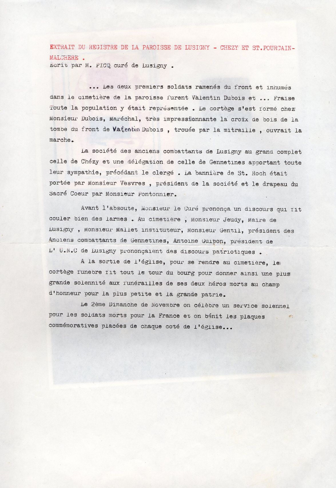 Les fils du maréchal-ferrand de Lusigny, Valentin et Mathieu Dubois, sont respectivement âgés de 19 et 22 ans lorsque la guerre éclate en 1914 (voir les registres matricules). Ils écrivent régulièrement à leurs parents.