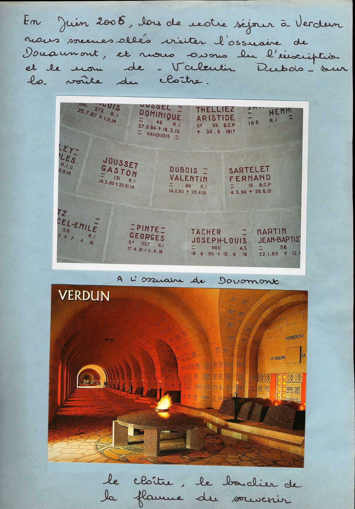 90 ans après sa mort, en 2006, sa famille s’est rendu sur les lieux où il perdit la vie (voir photos d’Esnes-sur-Argonne) ainsi qu’à Verdun et a pu lire son nom gravé depuis 1969 (voir les attestations de la gravure du nom) parmi tant d’autres sur les voûtes du cloître de l’ossuaire de Douaumont (voir photo de Douaumont).