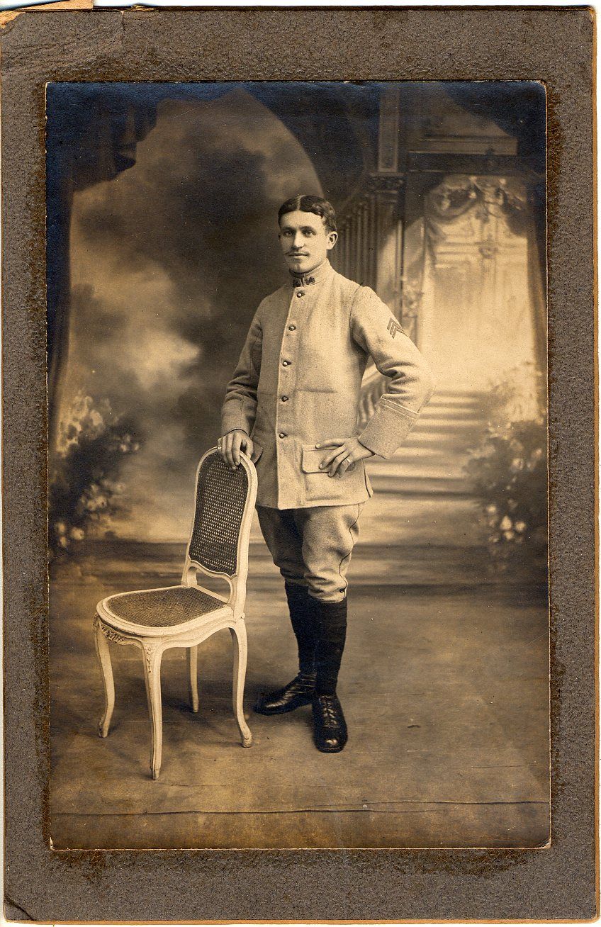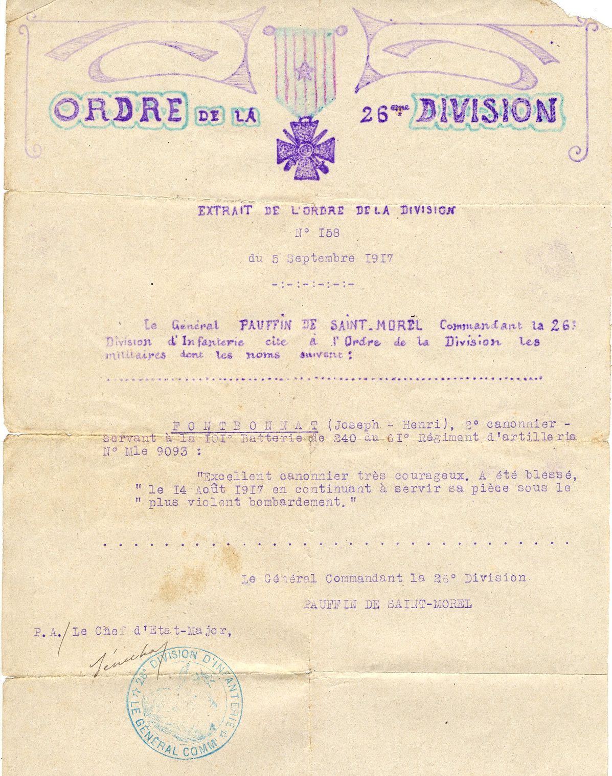 Joseph Fontbonnat (voir photos) chaudronnier en fer habitant Désertines, a 21 ans lorsque la guerre éclate en août 1914 (voir son feuillet matricule ). Affecté dans plusieurs régiments successifs d’artillerie, il est canonnier. Le 5 septembre 1917 il est cité à l’ordre de la 26e division d’infanterie : « Excellent canonnier très courageux. A été blessé le 14 août 1917 en continuant à servir sa pièce sous le plus violent bombardement. » (voir citation)