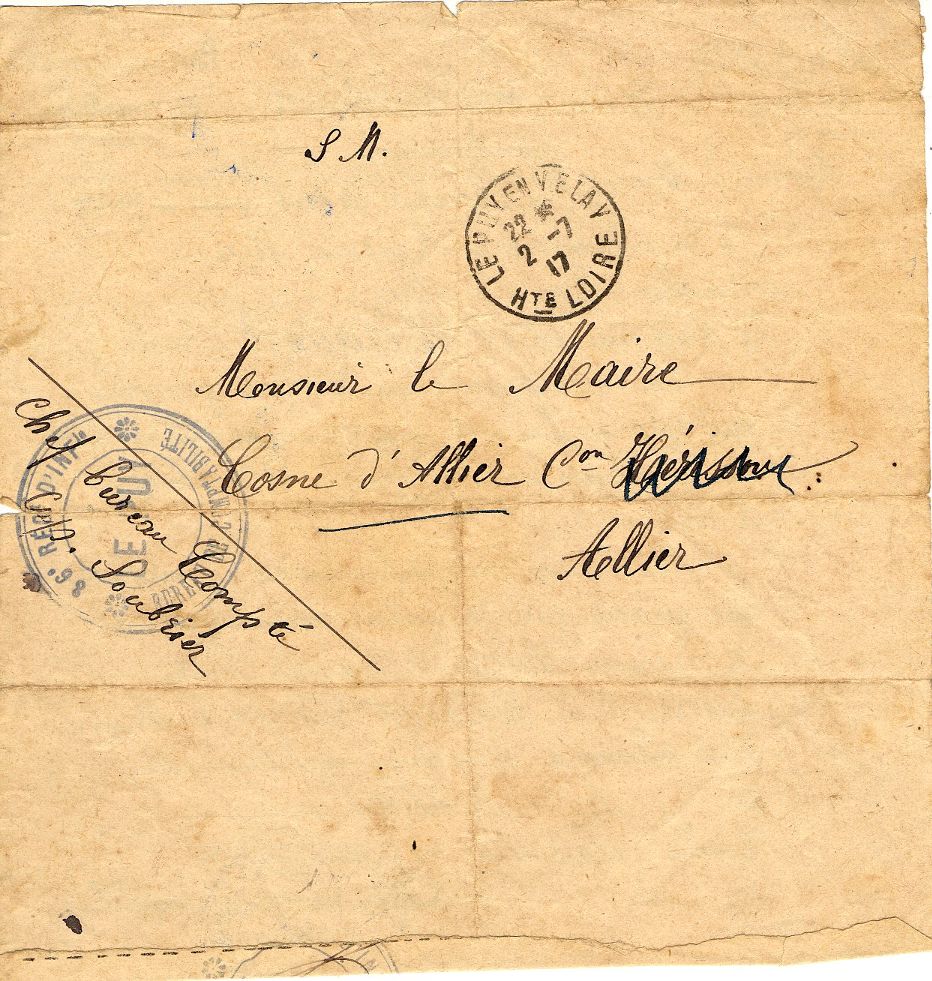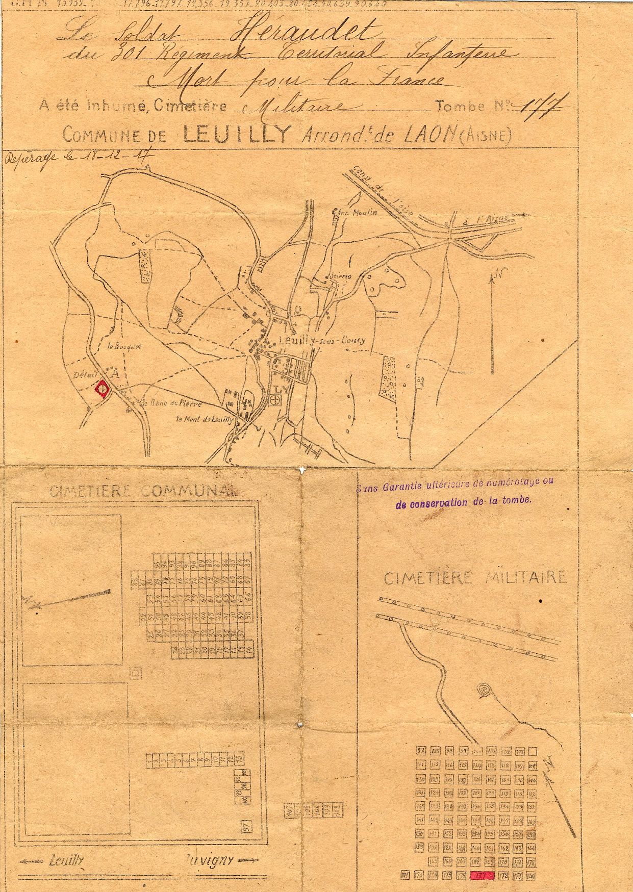 En juillet 1917, le maire de Cosne-d’Allier reçoit du bureau de comptabilité de la commune du Puy-en-Velay un avis du lieu d’inhumation de Charles Héraudet : au cimetière militaire de la Barre de Pierre sur la commune de Leuilly dans l’Aisne (voir plan).