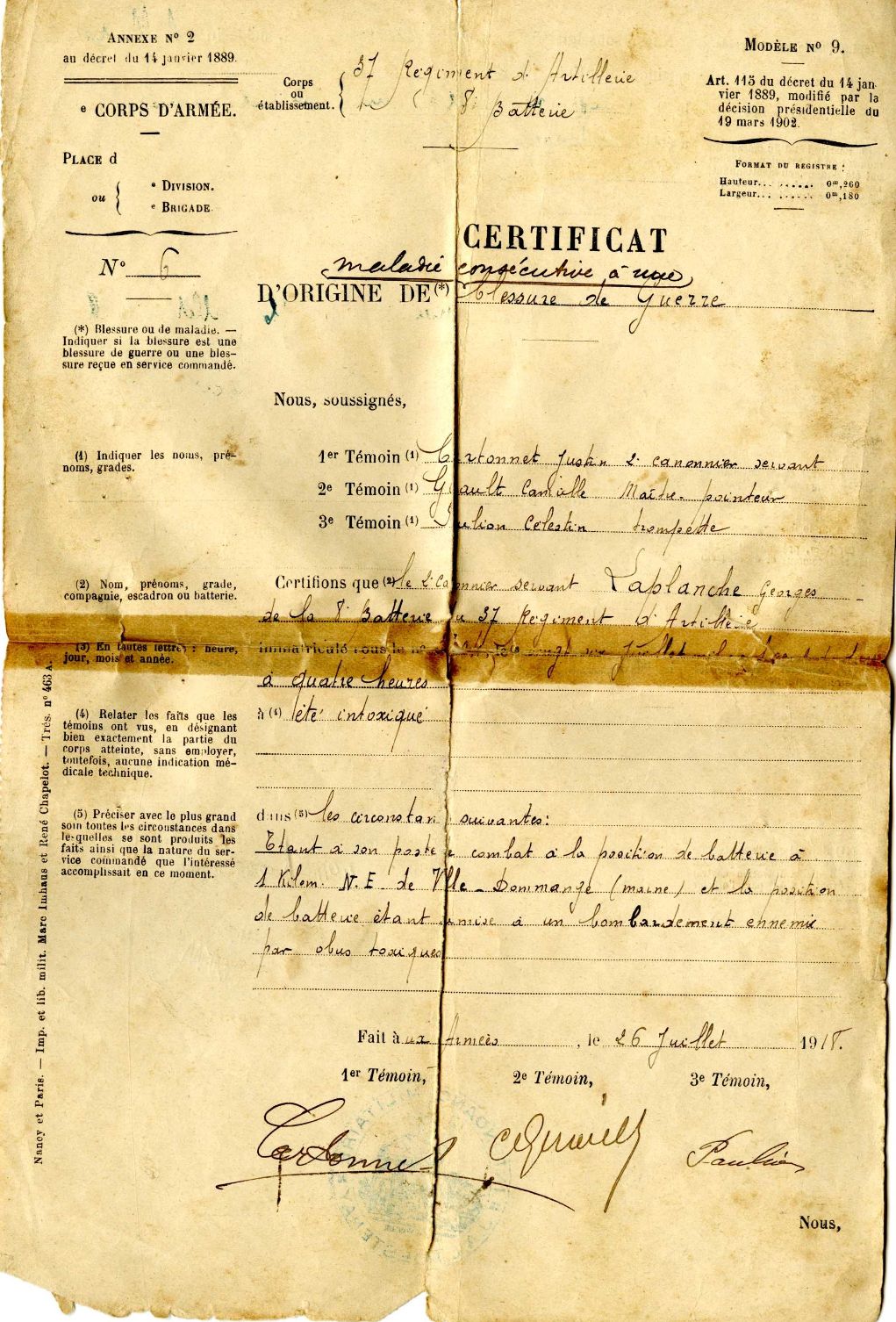 Le 26 juillet 1918 il est évacué suite à une intoxication aux gaz. Comme l’atteste son certificat de maladie consécutive à une blessure de guerre : « Etant à son poste de combat à la position de batterie à 1 km N-E. de Ville-Dommange (Marne) et la position de batterie étant soumise à un bombardement ennemi par obus toxiques » .