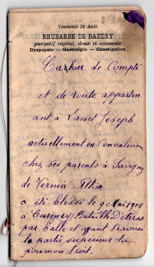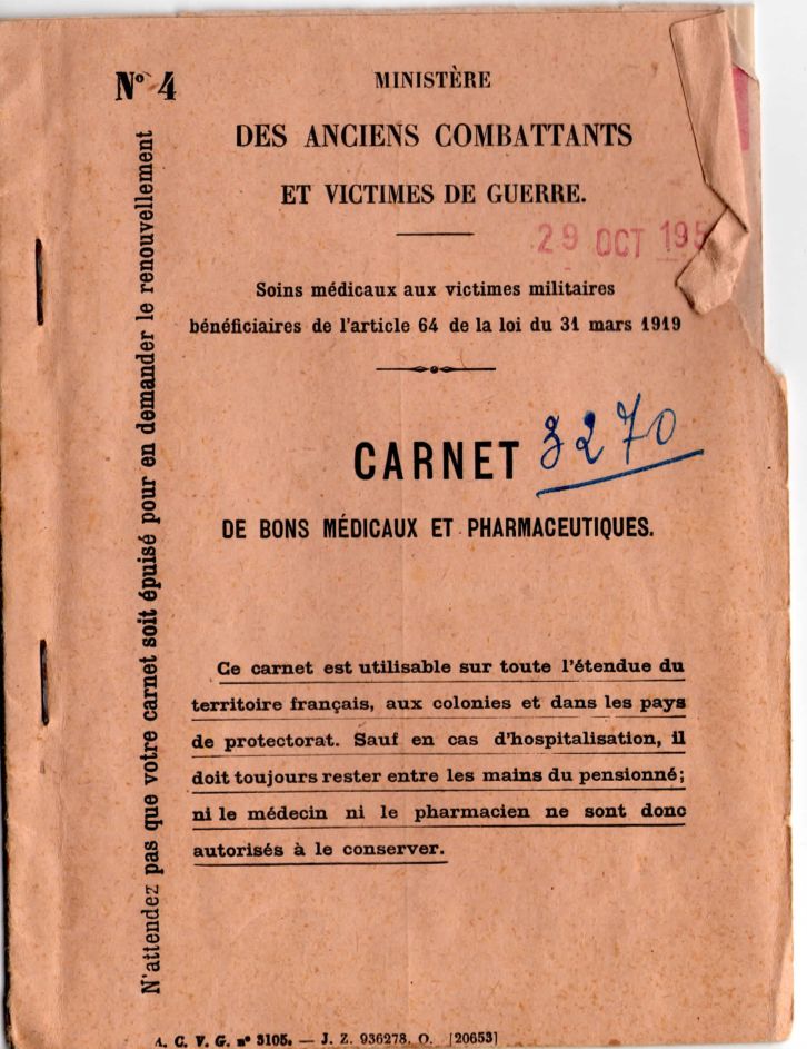 Il gardera de cette blessure des difficultés respiratoires (voir son carnet de bons médicaux et pharmaceutiques) qui lui vaudront 30% de taux d’invalidité et une pension.
