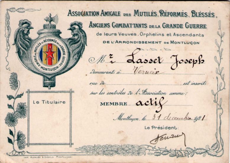 Après la guerre il adhère à l’association amicale des mutilés, réformés, blessés, anciens combattants de la Grande Guerre (voir sa carte de membre).