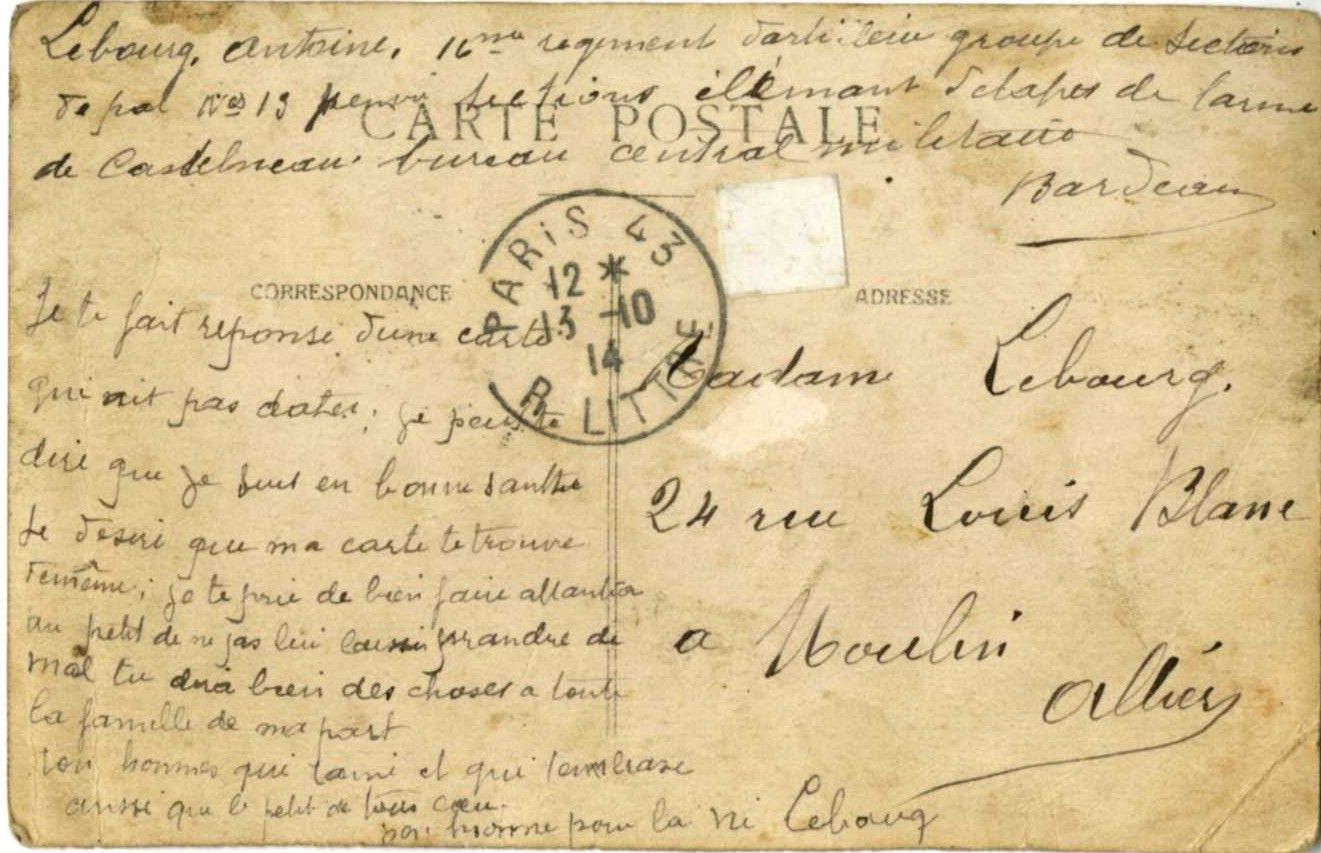 LEBOURG Antoine, de Moulins Moulins Carte d'Antoine Lebourg à sa femme, 13 octobre 1914 Carte d'Antoine Lebourg à sa femme, 13 octobre 1914 Carte d'Antoine Lebourg à sa femme, 13 octobre 1914. Format pdf. (437.2 Ko) Accès rapide Histoire du Bourbonnais 1914-1918 Sceaux et cachets #AllierJeudiArchives Nous contacter