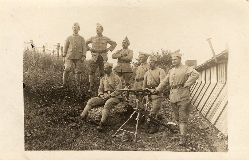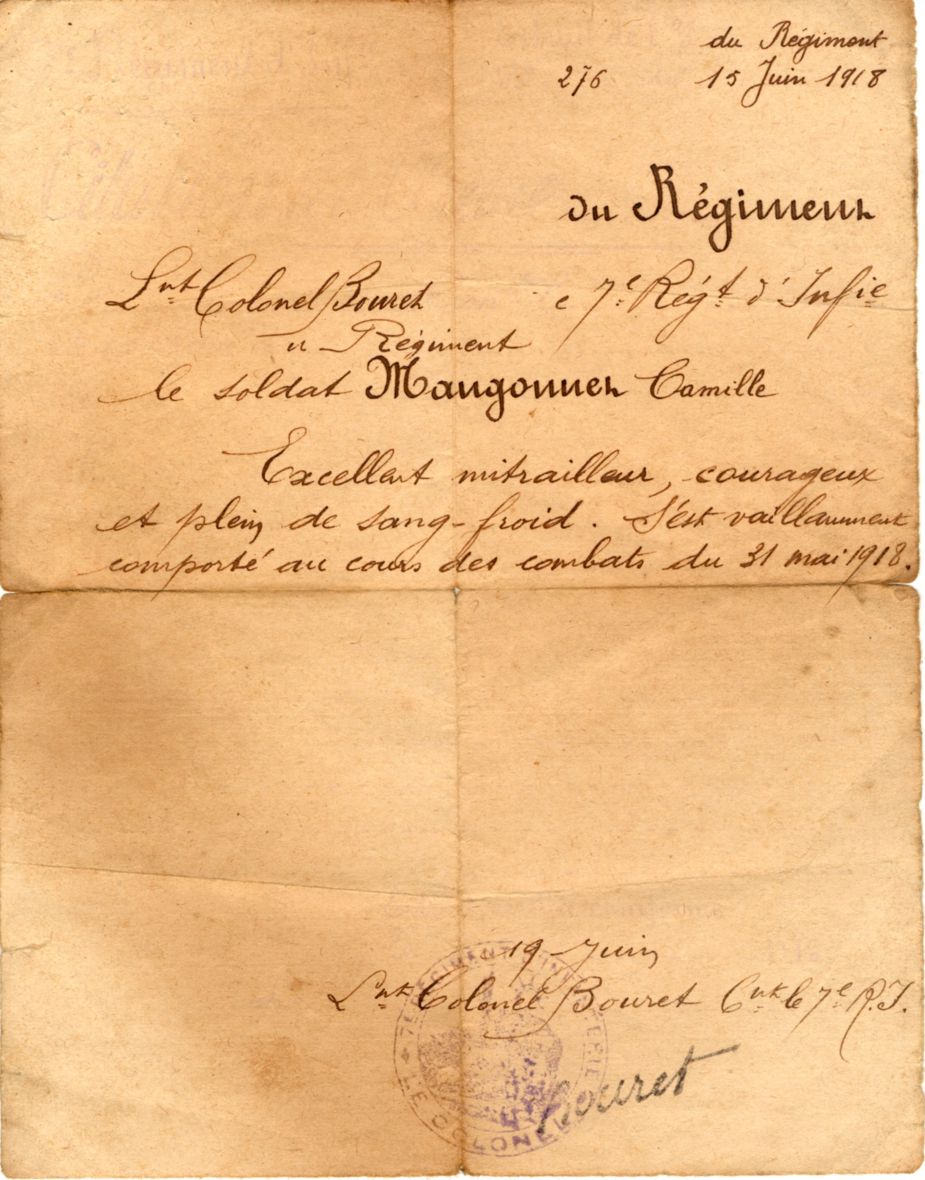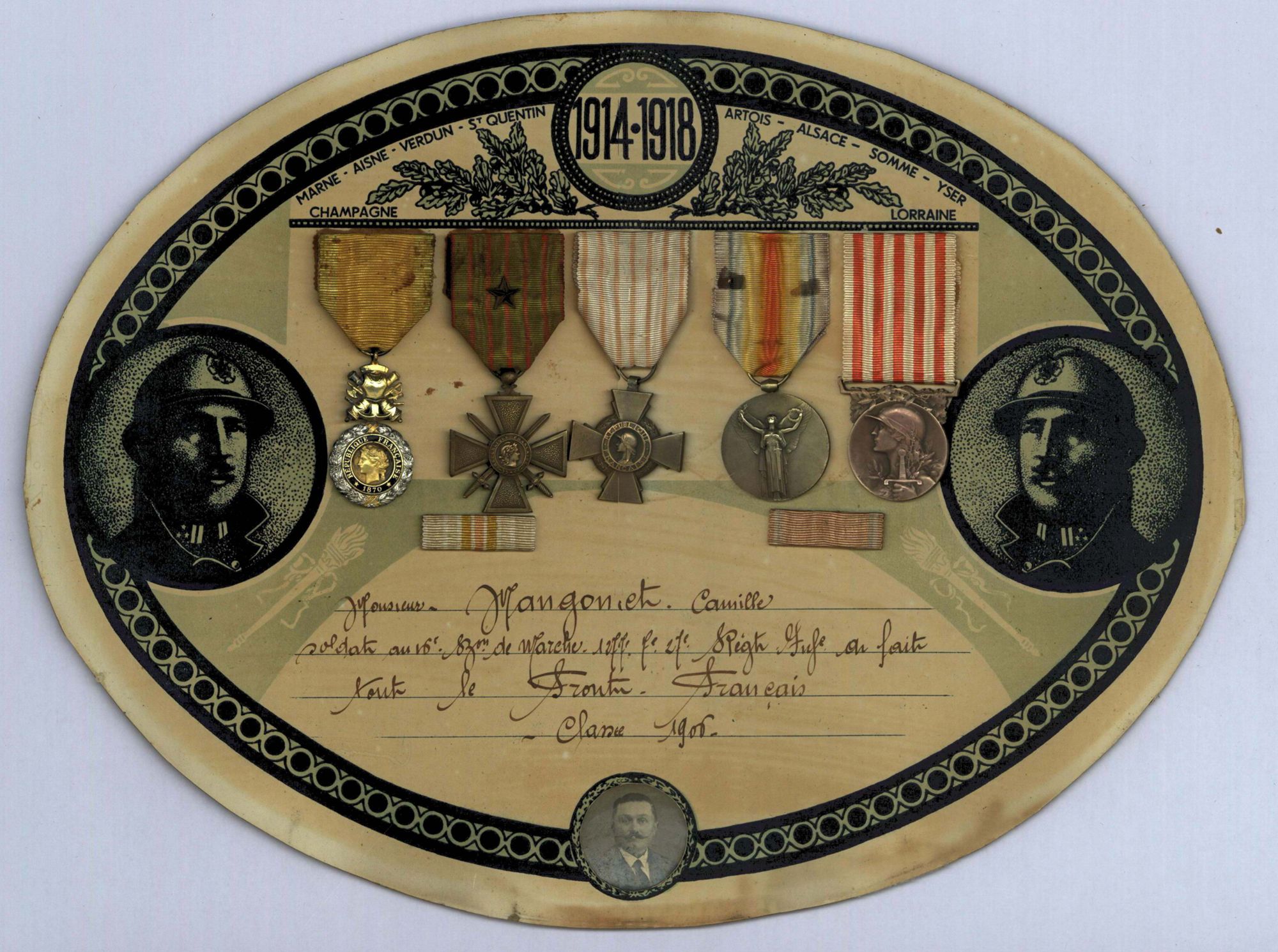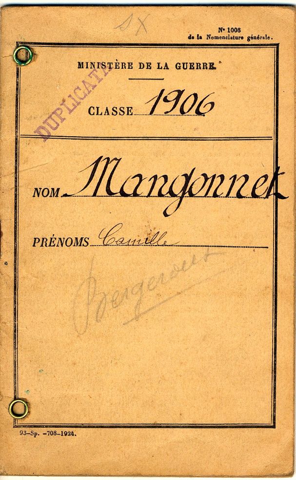 Camille Mangonnet (voir photos), est âgé de 28 ans lorsque la guerre éclate en 1914. Il est alors employé de commerce à Paris mais ses parents, cultivateurs habitent à Domérat. C’est au bureau de recrutement de Montluçon qu’il est inscrit sous le n° matricule 2296 et envoyé dans l’infanterie (voir son registre matricule et son livret militaire). Il fait partie du groupe des mitrailleurs (voir photo de groupe)