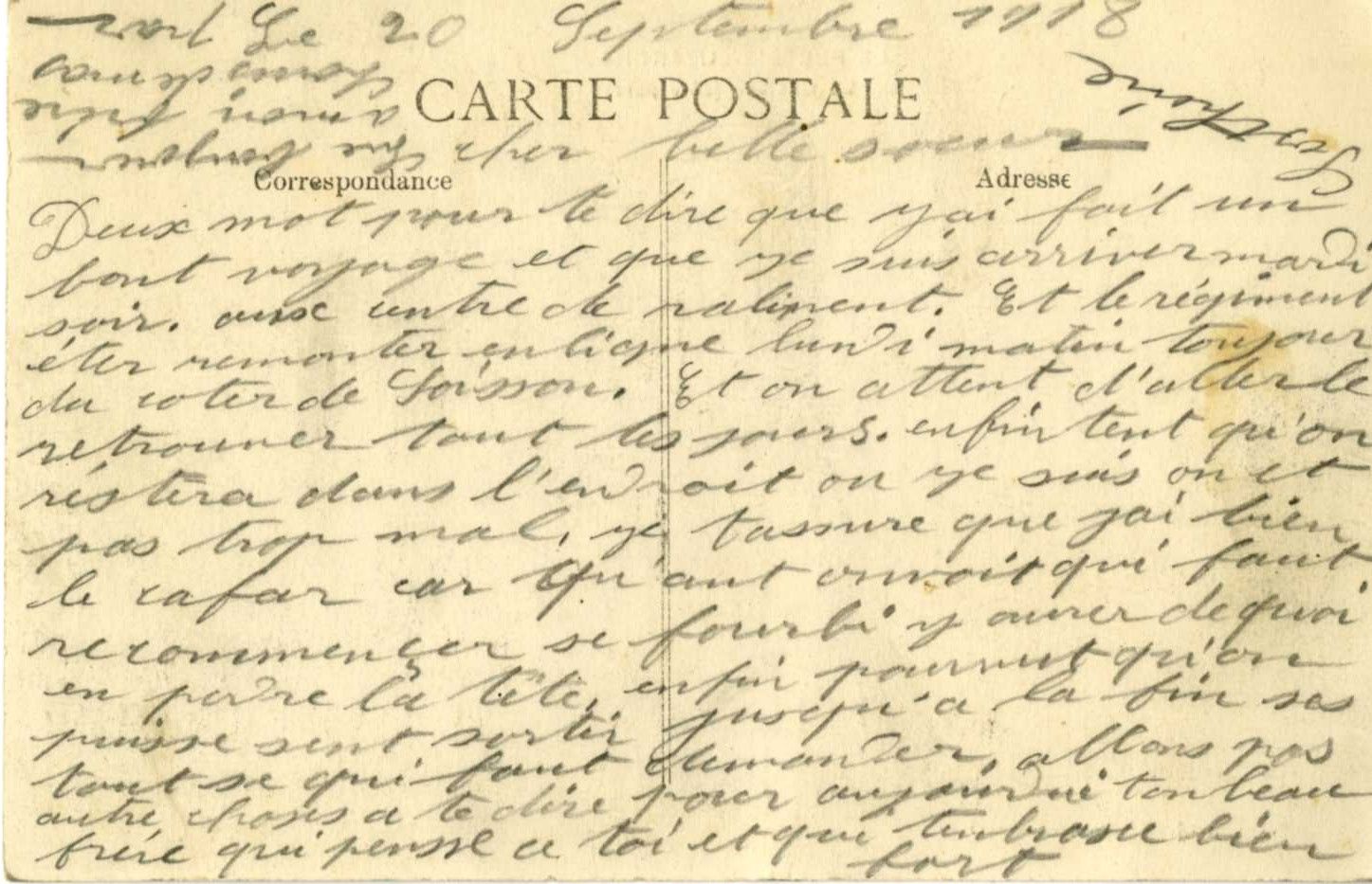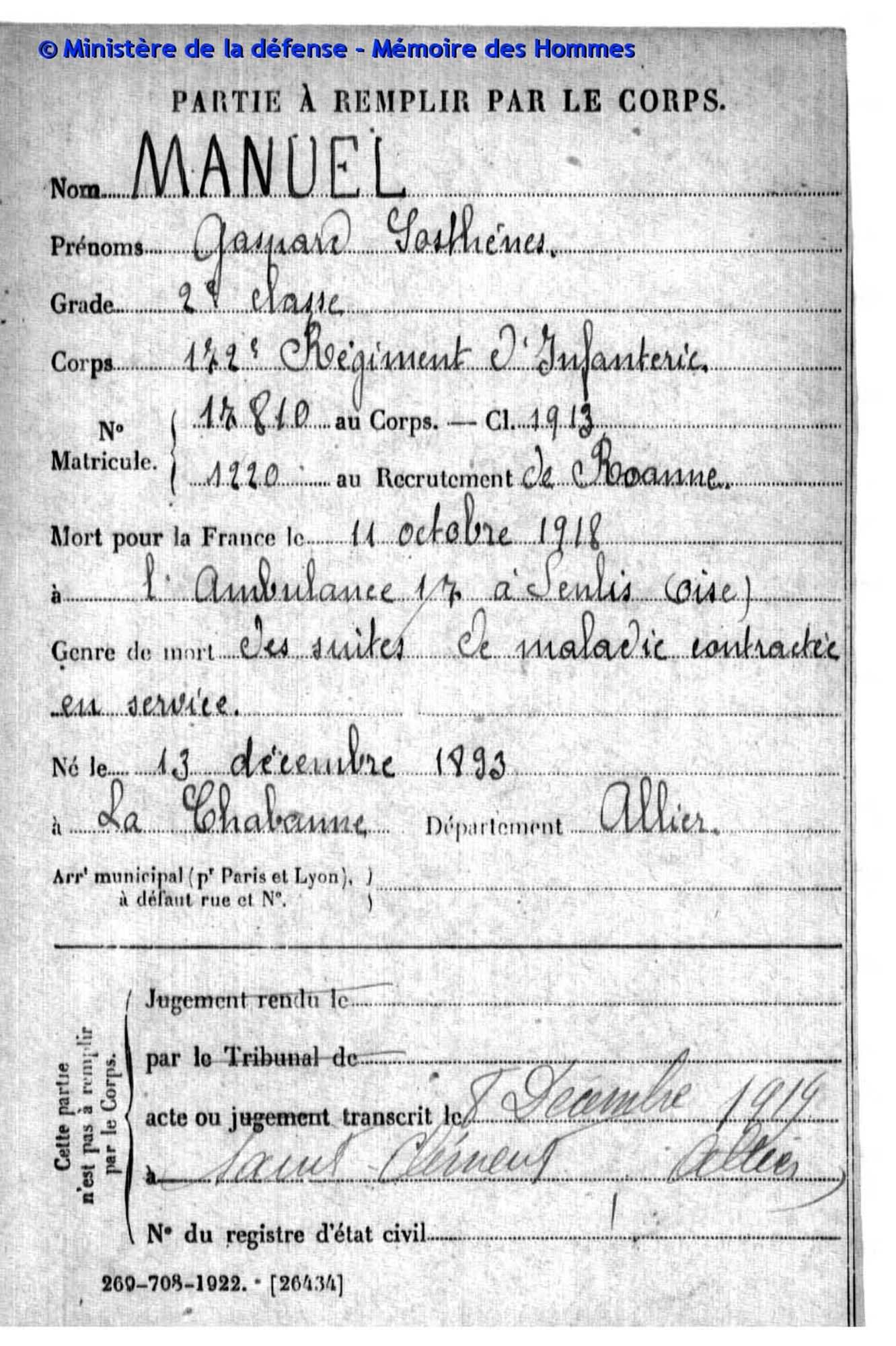 MANUEL Sosthène, de Saint-Clément Saint-Clément Carte de Sosthènes MANUEL à sa belle-soeur, 20 septembre 1918. Il meurt peu après le 11 octobre 1918 Carte de Sosthènes MANUEL à sa belle-soeur, 20 septembre 1918. Il meurt peu après le 11 octobre 1918 Carte postale de Sosthène MANUEL à sa belle-soeur, , 20 septembre 1918. Il meurt peu après le 11 octobre 1918. Format pdf. (745.3 Ko) Voir documents militaires de Sosthène MANUEL. format pdf. (1.1 Mo) Registre matricule de Sosthène MANUEL Accès rapide Histoire du Bourbonnais 1914-1918 Sceaux et cachets #AllierJeudiArchives Nous contacter