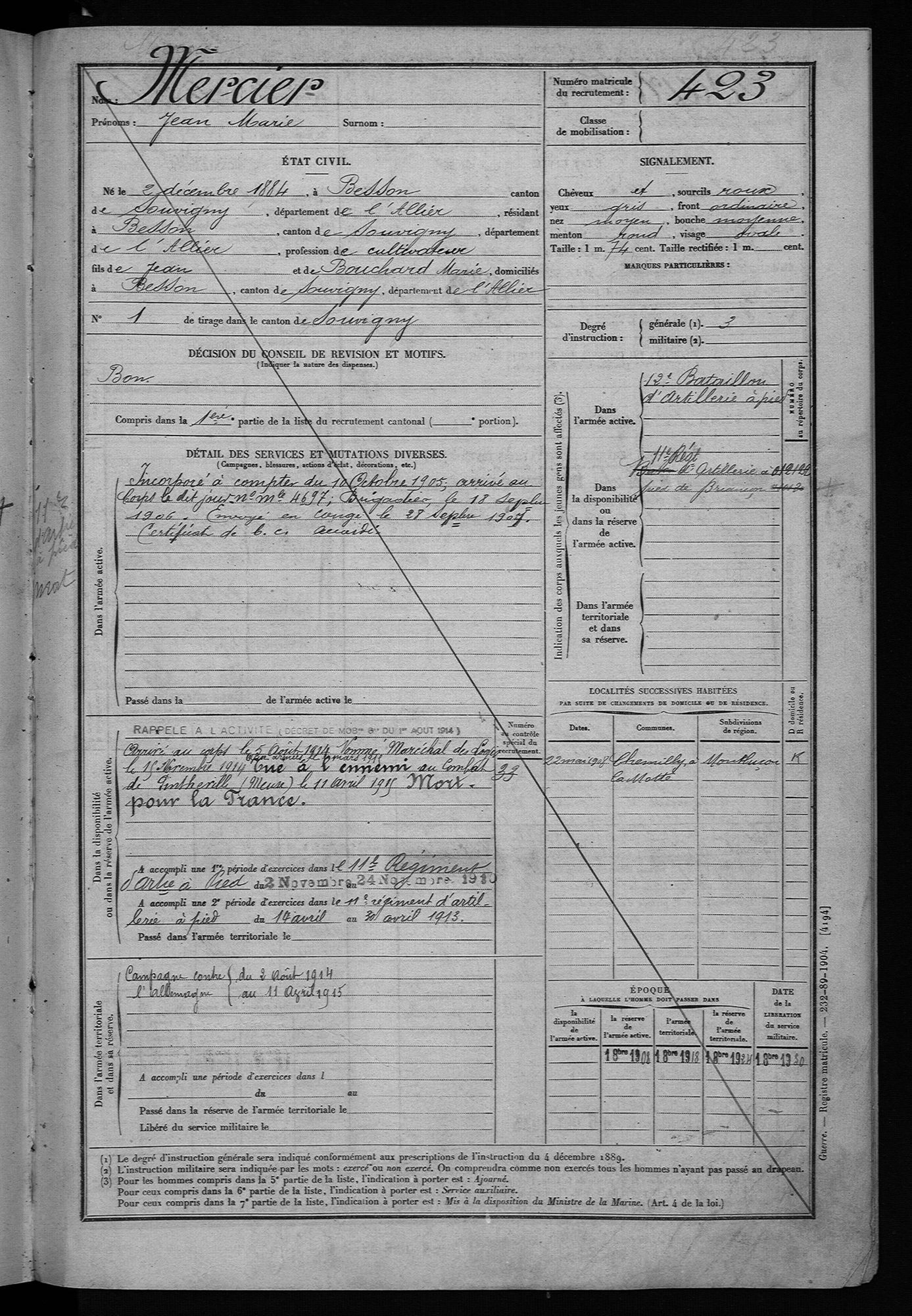 Jean-Marie Mercier est originaire de Besson dans le département de l’Allier où il exerce le métier de cultivateur. Mobilisé le 2 août 1914, il rejoint le 11e régiment d’artillerie à pied en février 1915 (voir registre matricule ), avec le grade de maréchal des logis.