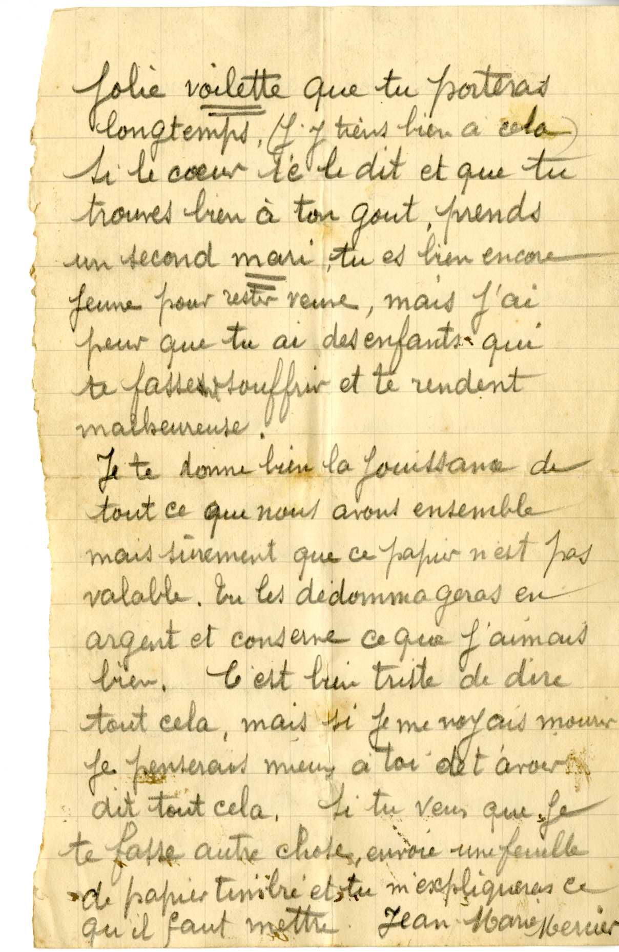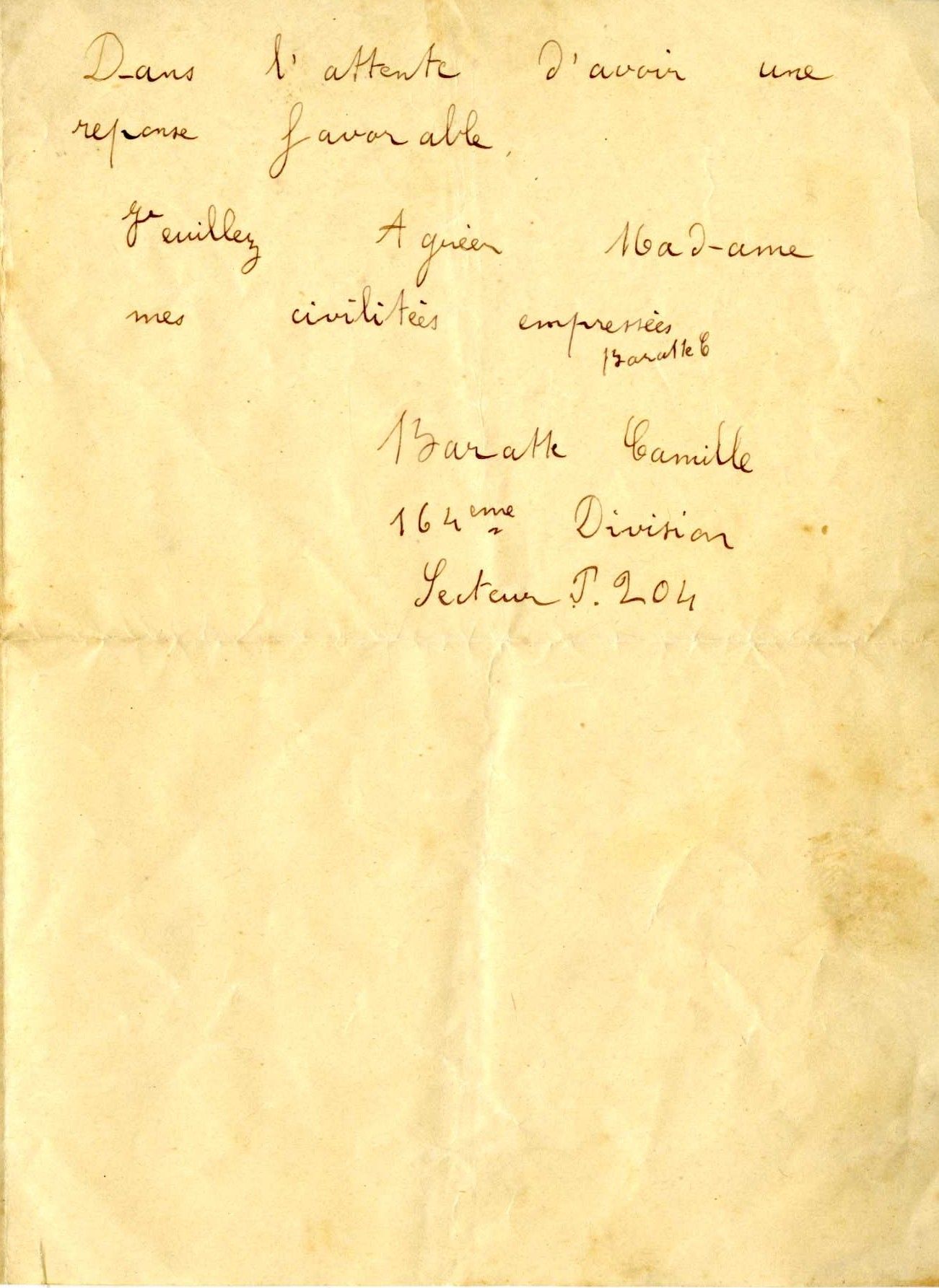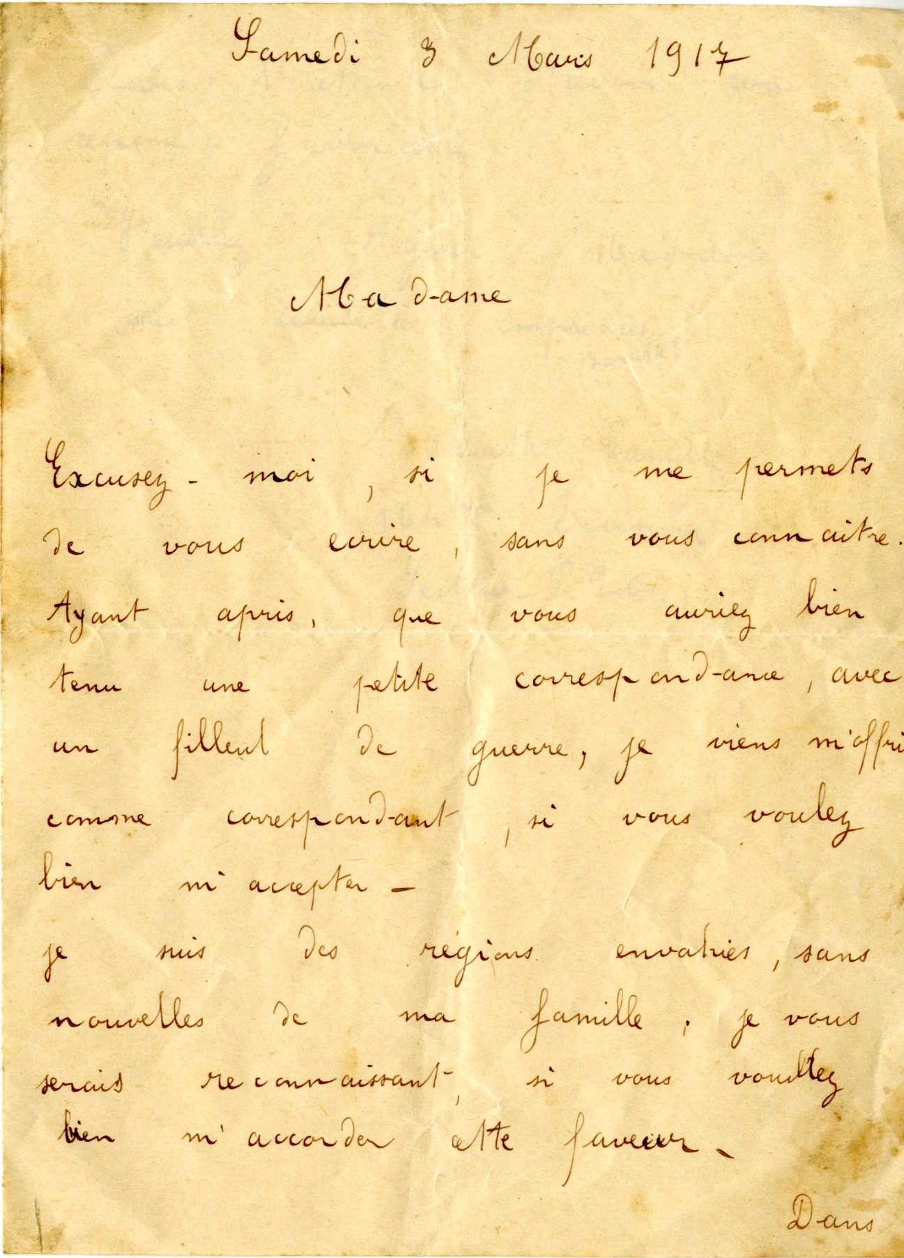 En plus de lot de lettres échangées entre les deux époux, il a été retrouvé dans les archives familiales, une lettre d’un soldat, Camille Baratte, qu’on imagine adressée à Anna Mercier, lui demandant de devenir sa marraine de guerre.