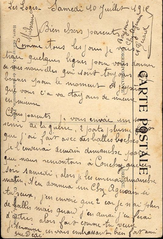 En dehors des combats et à l’image de nombreux « Poilus », Gilbert Micheau confectionna des objets en guise de souvenir de guerre. C’est ainsi qu’il réalisa des portes plumes à partir de balles ennemies qu’il envoya à ses parents (voir carte du 10 juillet 1915).