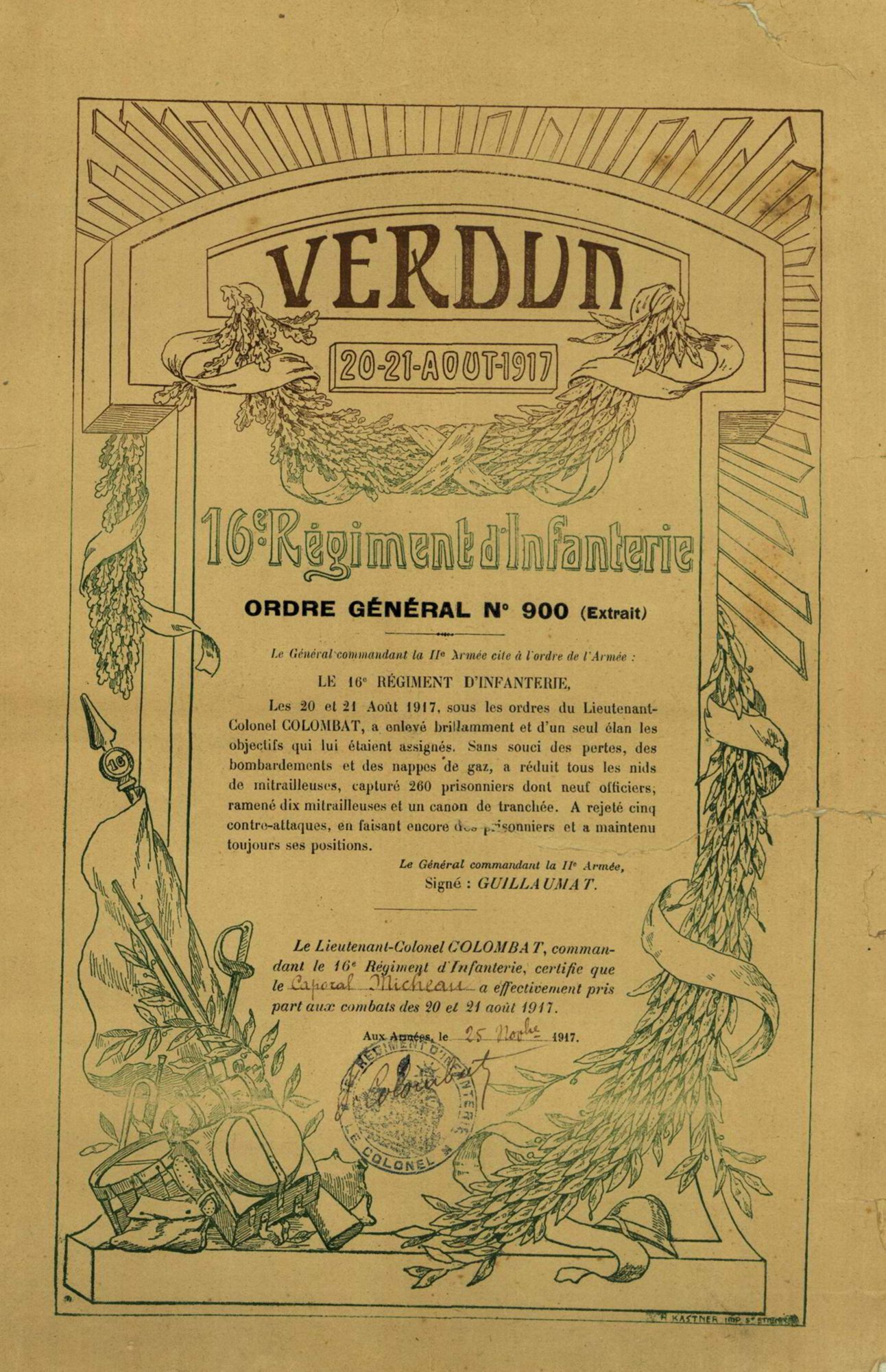 Le 16e Régiment d’Infanterie auquel appartenait Gilbert Micheau, s’est particulièrement illustré lors des grandes batailles. En mars 1916, les combats s’intensifient autour du bois des Corbeaux aux abords de Verdun : « on franchit les tranchées, des trous énormes, des réseaux de fil de fers enchevêtrés, on piétine des cadavres, les rangs s'entremêlent, les barrages de l'artillerie allemande se font de plus en plus violents; les mitrailleuses crépitent et dans l'immense confusion, l'orientation se perd ». (voir historique du 16eRI)