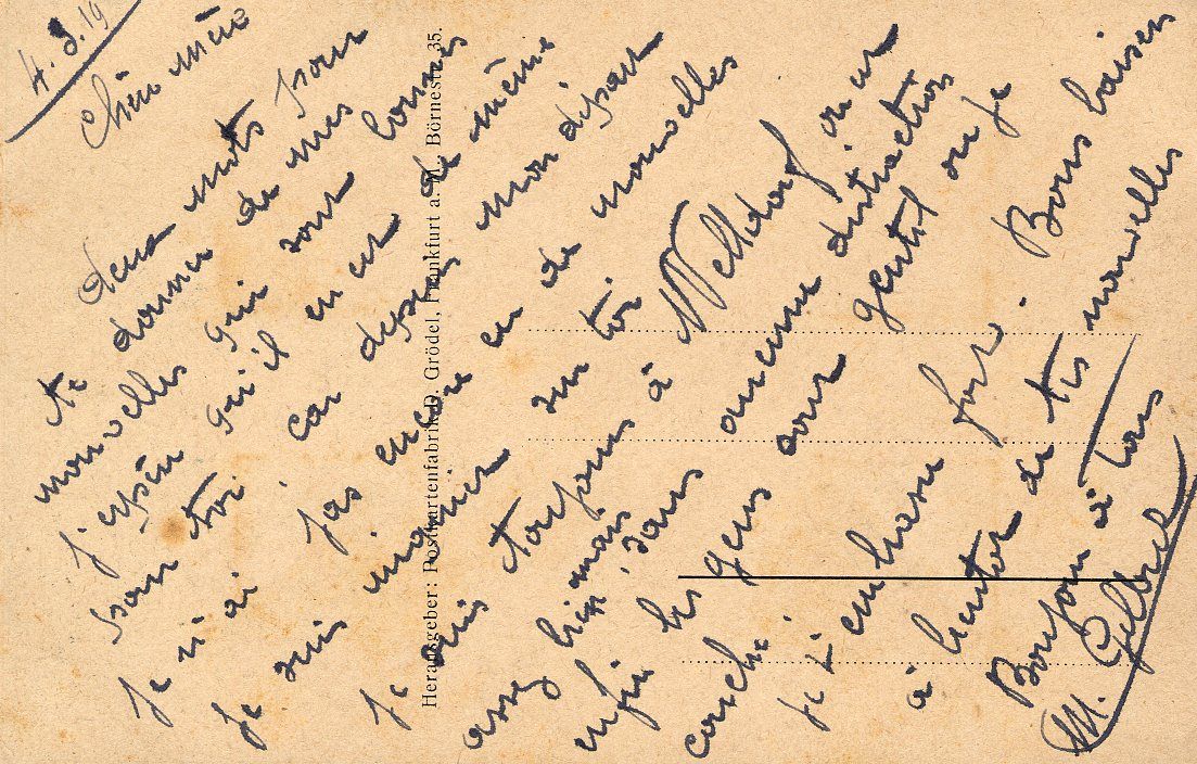La signature de l’Armistice le 11 novembre 1918 ne signifie pas la fin de la guerre pour de nombreux soldats. Gilbert Micheau lui, continua son service en Allemagne, à Walldorf . Là-bas, c’est de l’ennui dont il se plaint. Dans une de ses cartes datant du 4 mars 1919 il écrit: « Je suis toujours à Walldorf, on est assez bien mais sans aucune distraction » (voir lien vers lettre du 4 mars 1919).
