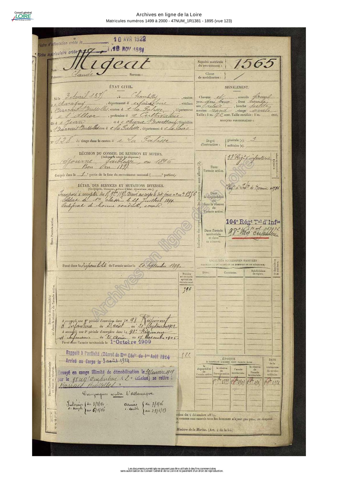 Claude Migeat, (voir photo), cultivateur de Barrais-Bussolles, a 39 ans lorsque la guerre éclate en 1914. Il est affecté dans le 104e régiment d’infanterie de l’armée territoriale (voir son registre matricule).