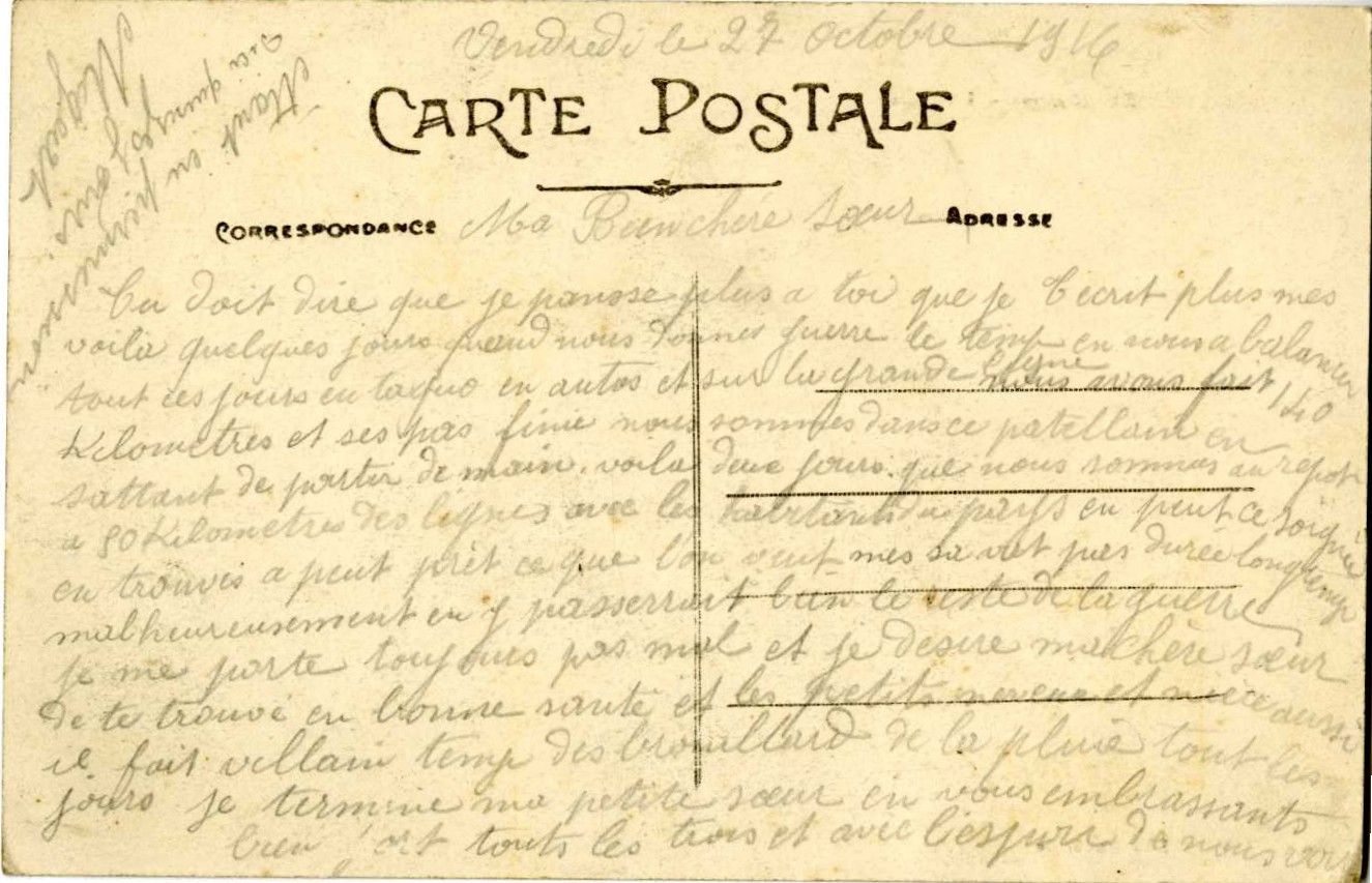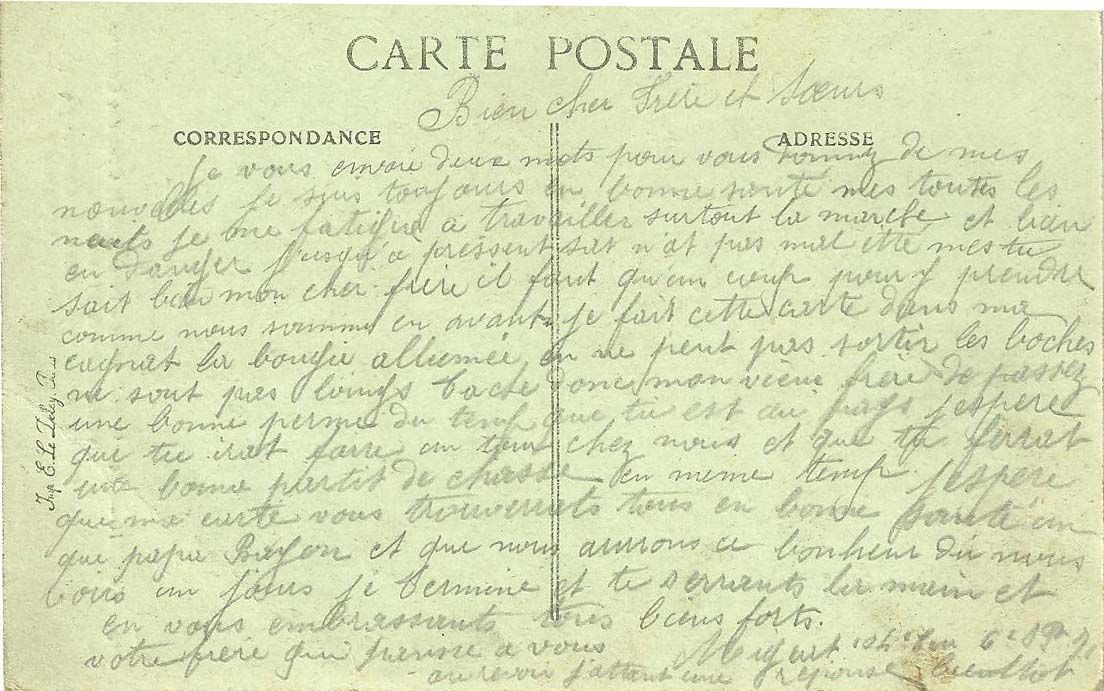 Dans une carte envoyée à sa sœur le 27 octobre 1914 il évoque son rapprochement des lignes : "en nous a balancer tout ces jours en taquo en autos et sur la grande ligne nous avons fait 140 kms et ses pas finie nous sommes dans ce patellain en sattant de partir demain. Voila deux jours que nous sommes au repot a 50 km des lignes en peut ce soignée en trouves a peut prêt ce que l'on veut mes sa vat pas durée lontemp malheureusement en y passerait bien le reste de la guerre"