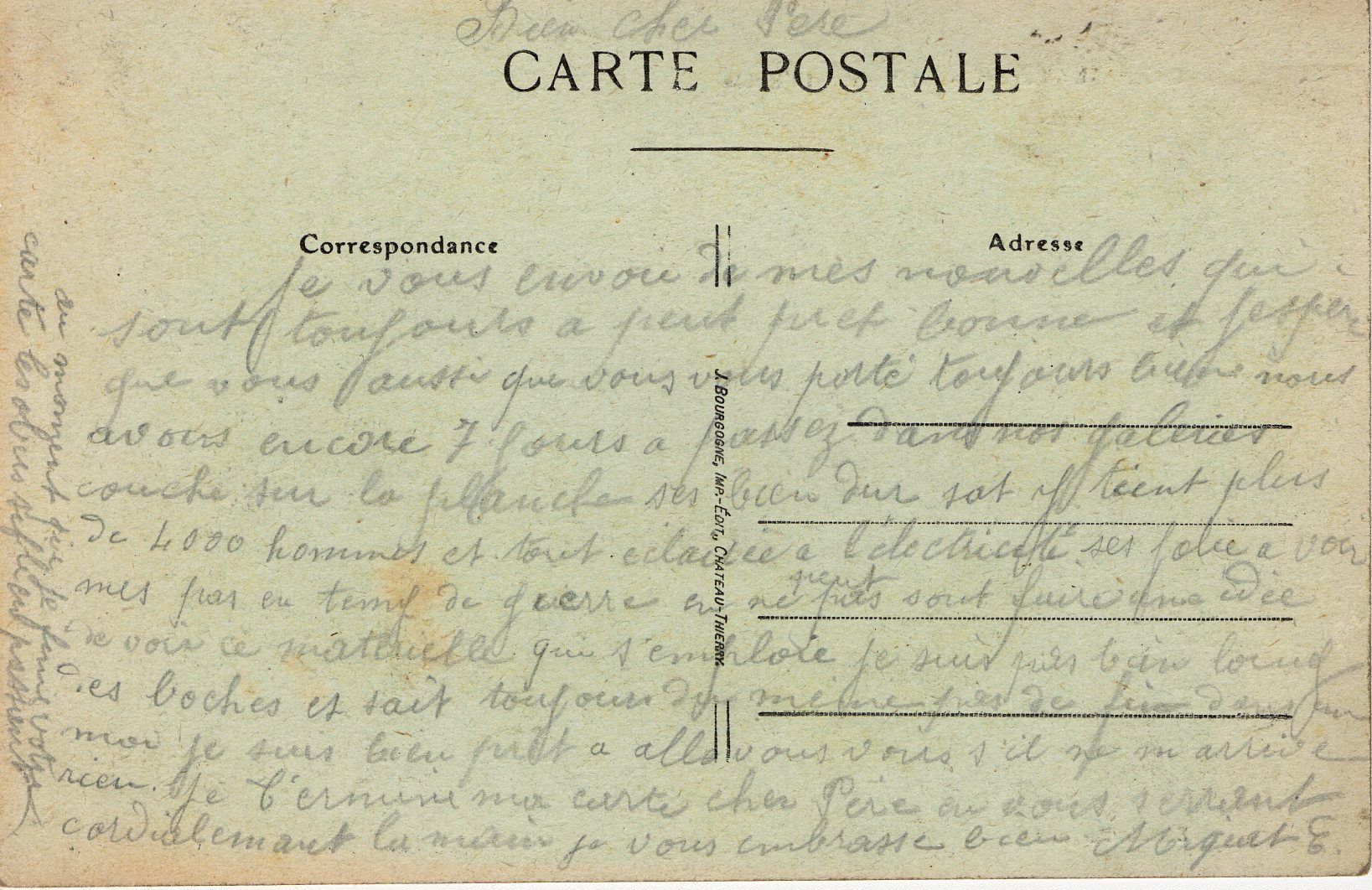 A son père il décrit les galeries (de mines ?) où il est : "nous avons encore 7 jours a passez dans nos galeries couché su la planche ses bien dur sat y tient plus de 4000 hommes et tout eclairee a l'electricité ses folie a voir mes pas en temp de guerre en ne peut pas sont faire une idée de voir ce materielle qui s'emploie (...)au moment que je ferme votre carte les obus siflent en passant"