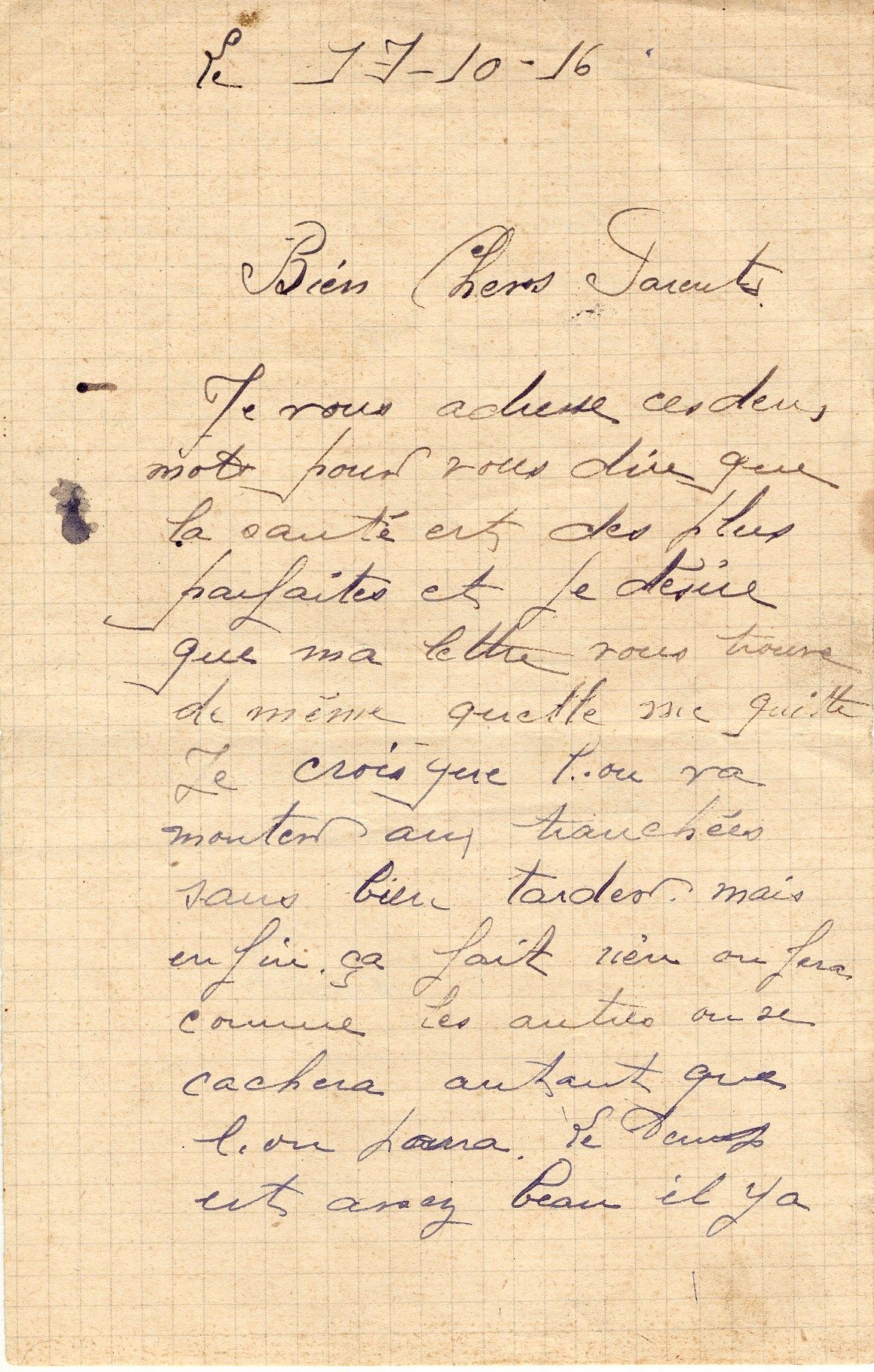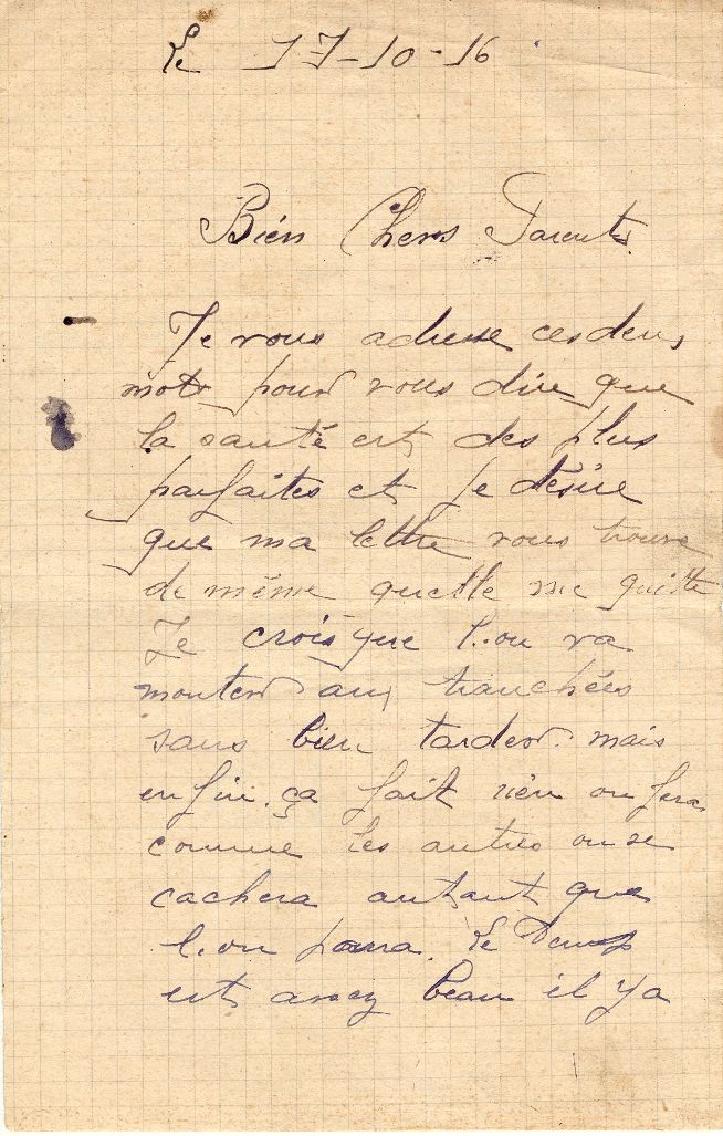 André Passat, dernière lettre à ses parents datée du 17 octobre 1916. Il est mort 5 jours après, le 22 octobre 1916, à Sailly-Saillissel dans la Somme