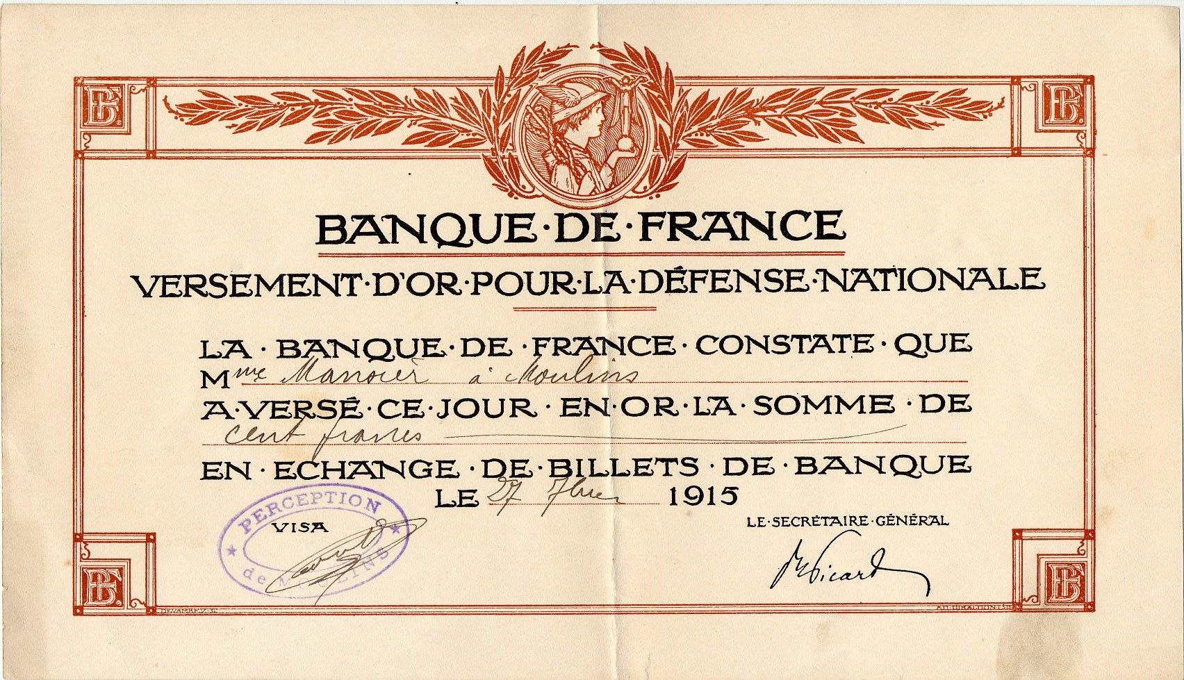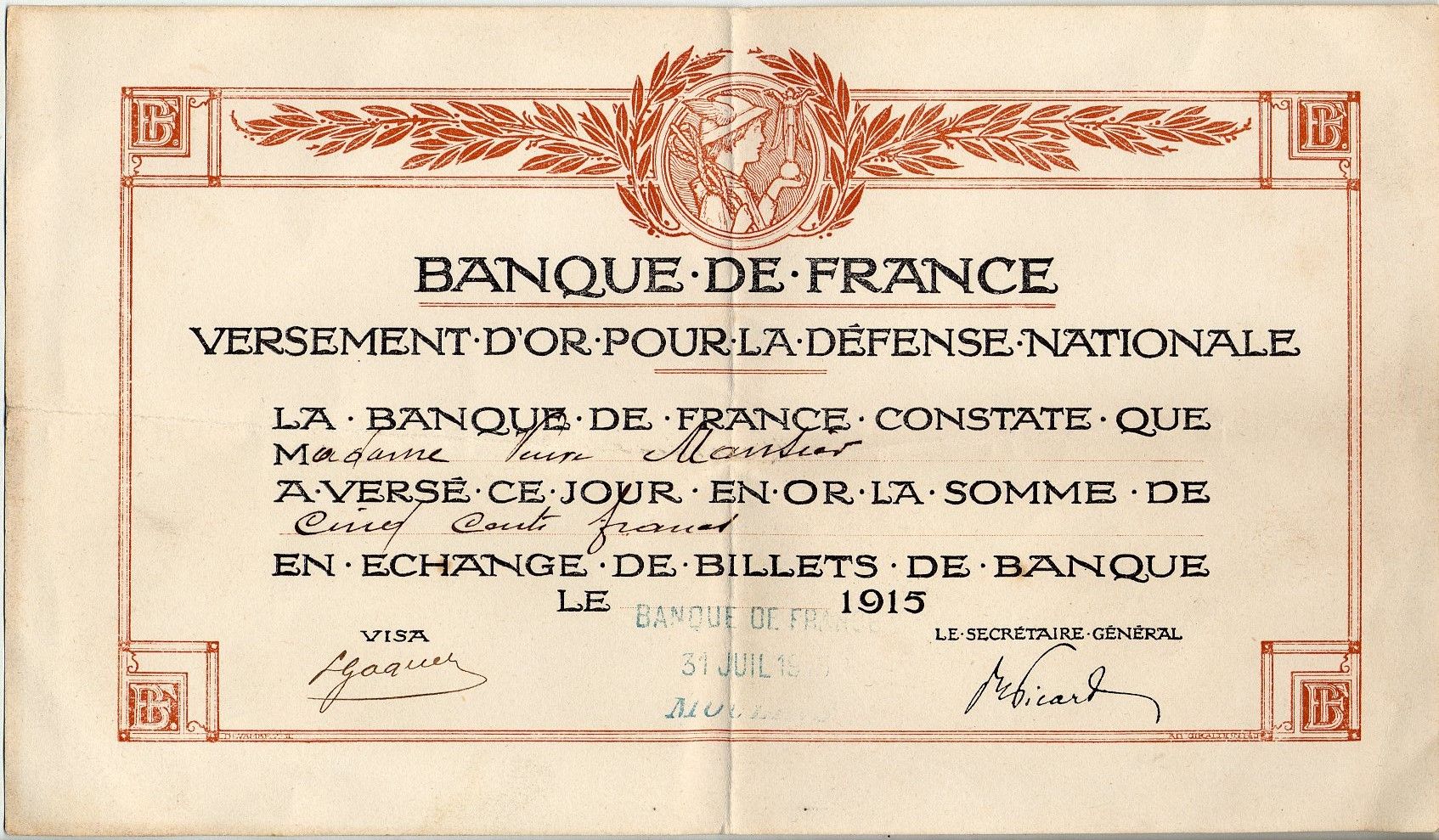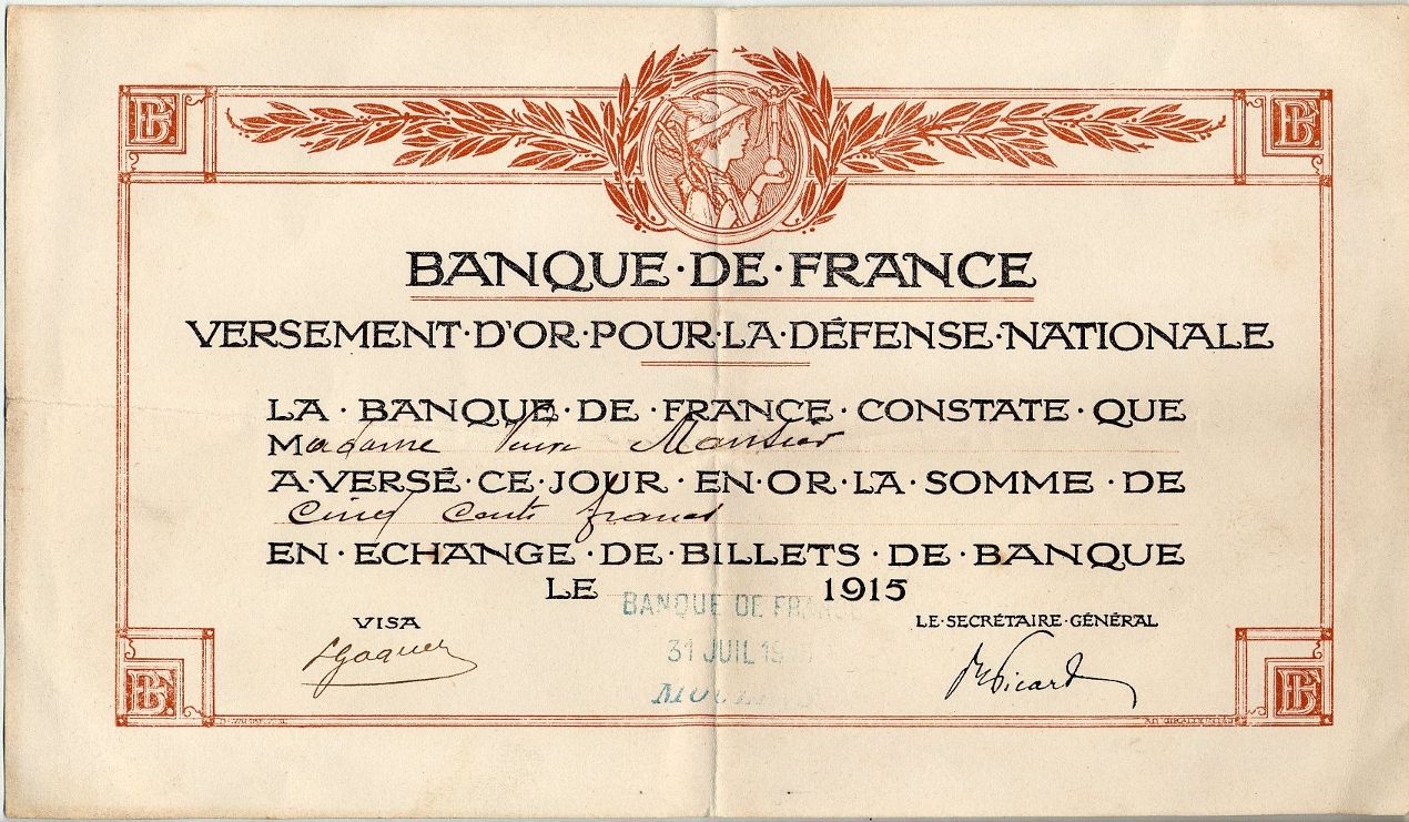 Défense Nationale : attestations de la Banque de France pour le versement d'or, 1915.Défense Nationale : attestations de la Banque de France pour le versement d'or, 1915.