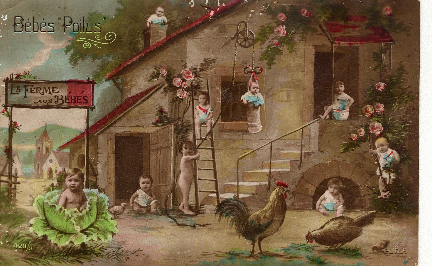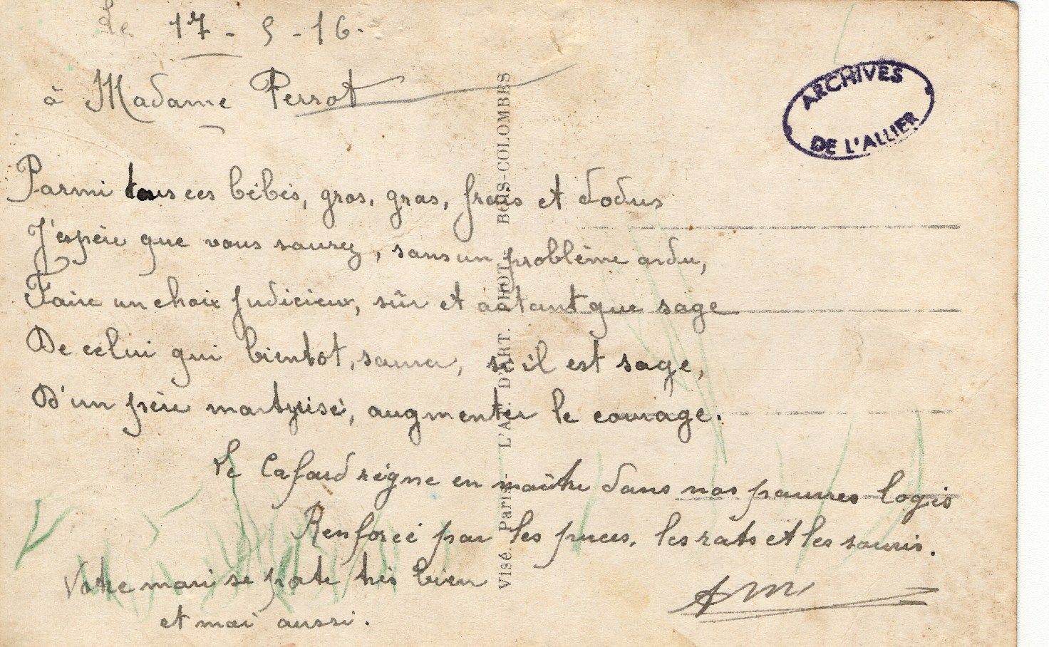 Un ami envoie à Mme Perrot une carte postale comportant des « Bébés poilus » en illustration avec ces quelques vers :
