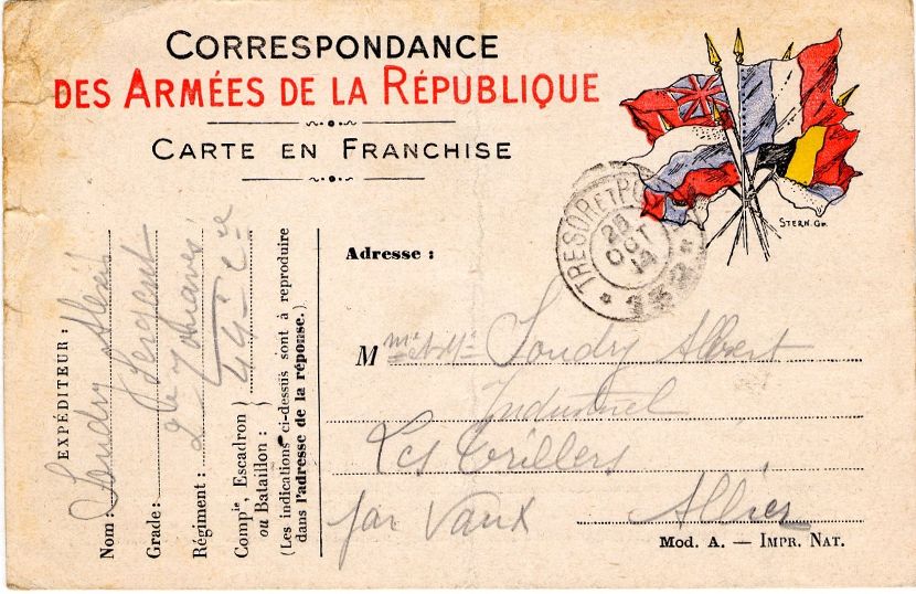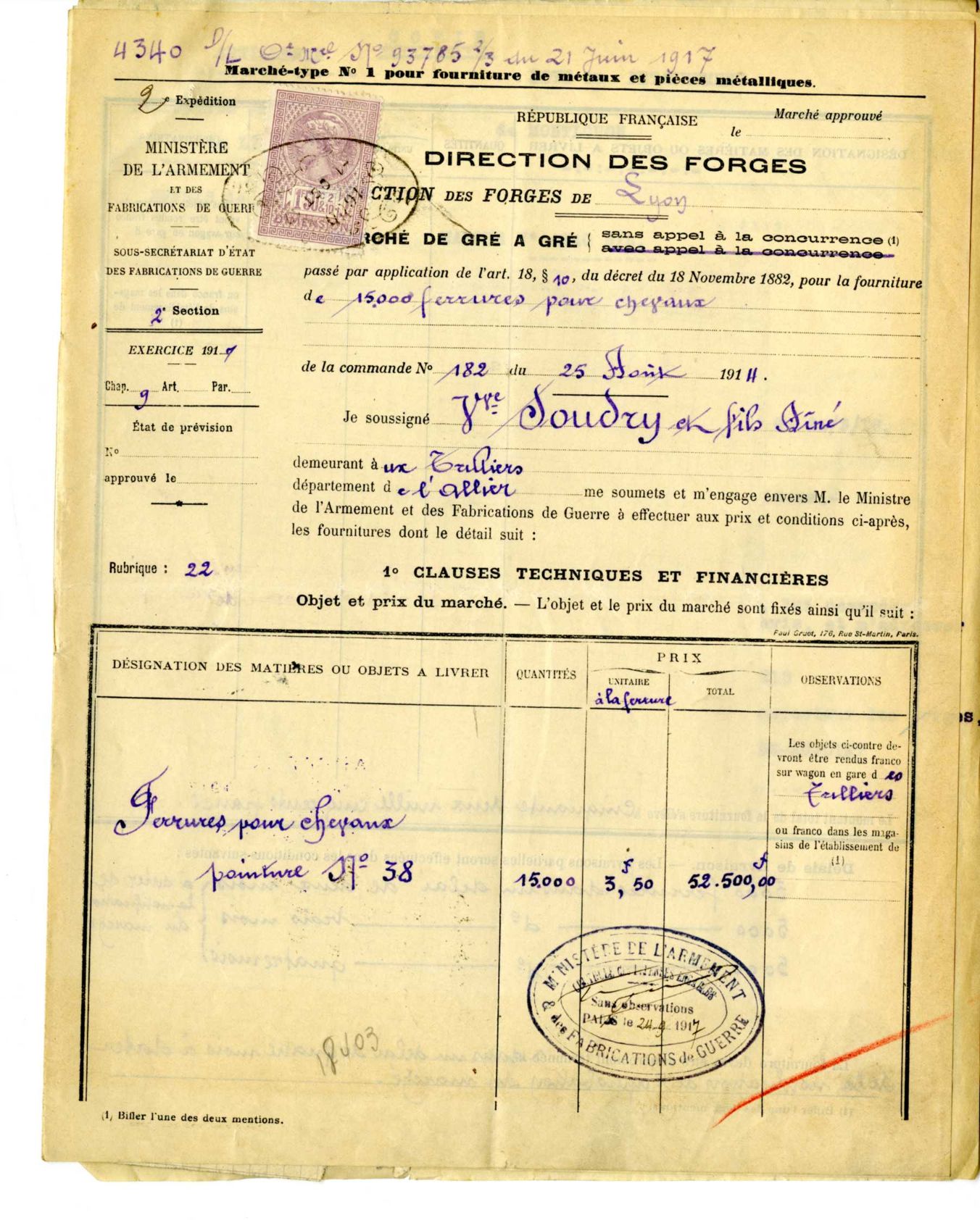 En 1910, il fait ses classes en Tunisie dans un régiment de zouaves (voir les photos de lui en uniforme). En août 1914, il est incorporé (voir son registre matricule ) et nommé sergent le 1er octobre 1914. Tout au long de la guerre il correspond avec son frère aîné Albert et sa mère (voir lettres). Il essaie de rassurer cette dernière qui en effet n’hésite pas à écrire aux Chemins de fer et au capitaine de son régiment de zouave pour s’assurer la bonne réception de ses colis (voir lettres de réponse de novembre 1914). En juillet 1917 il est transféré au 121ième régiment d’infanterie. Suite à la promulgation de la Loi Mourier du 10/08/1917 (cf. article 3), il est détaché à l’usine familiale car « appartenant à une classe trop jeune et affecté à un emploi technique spécialiste qualifié ». Les forges de Vaux participent à l’effort de guerre en fournissant notamment des fers pour les chevaux de plus en plus sollicités (voir lettre de commande de l'armée). Le 23/05/1918, Alexis Soudry doit retourner au front, il est affecté au 57ème Régiment d’Infanterie.