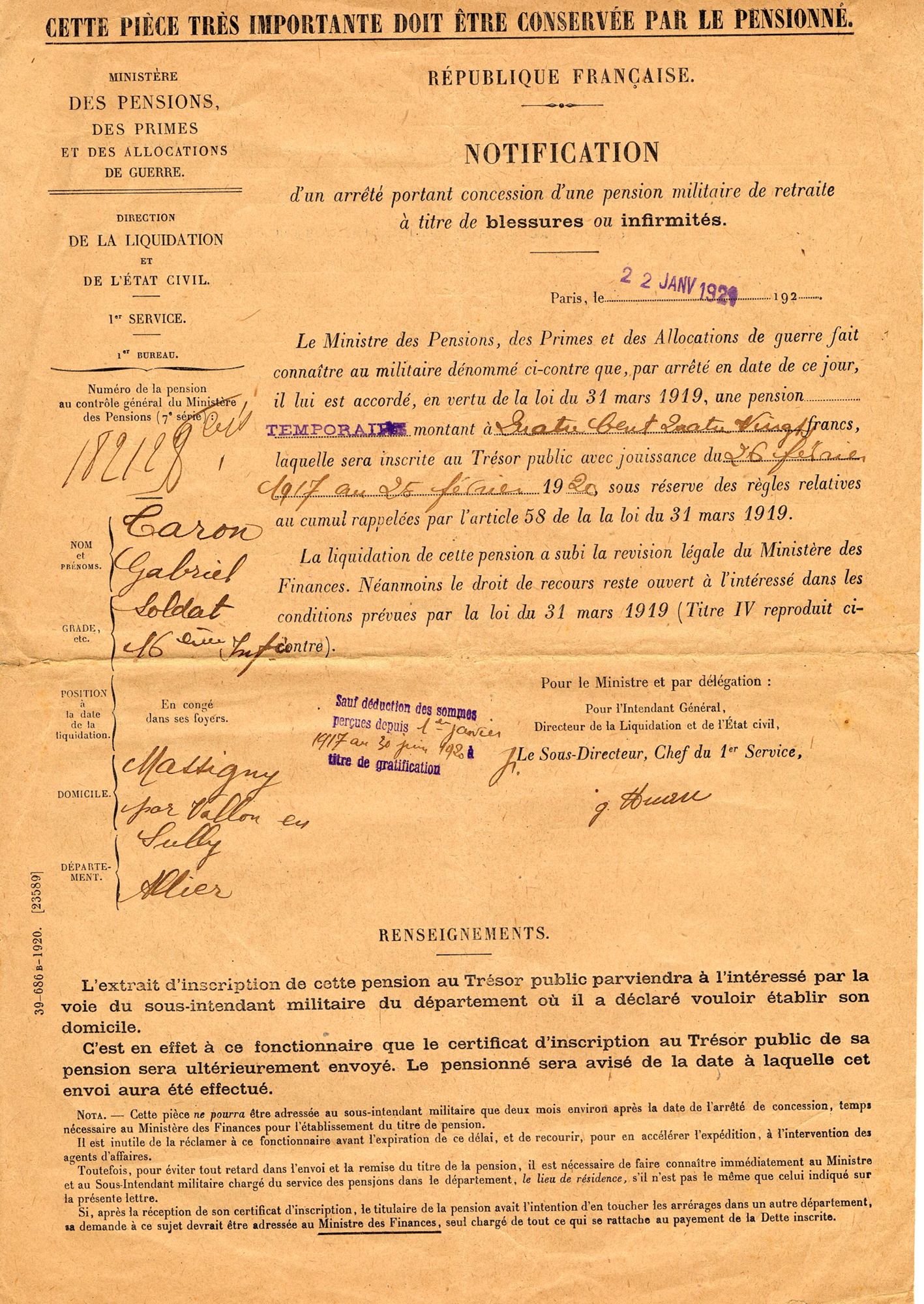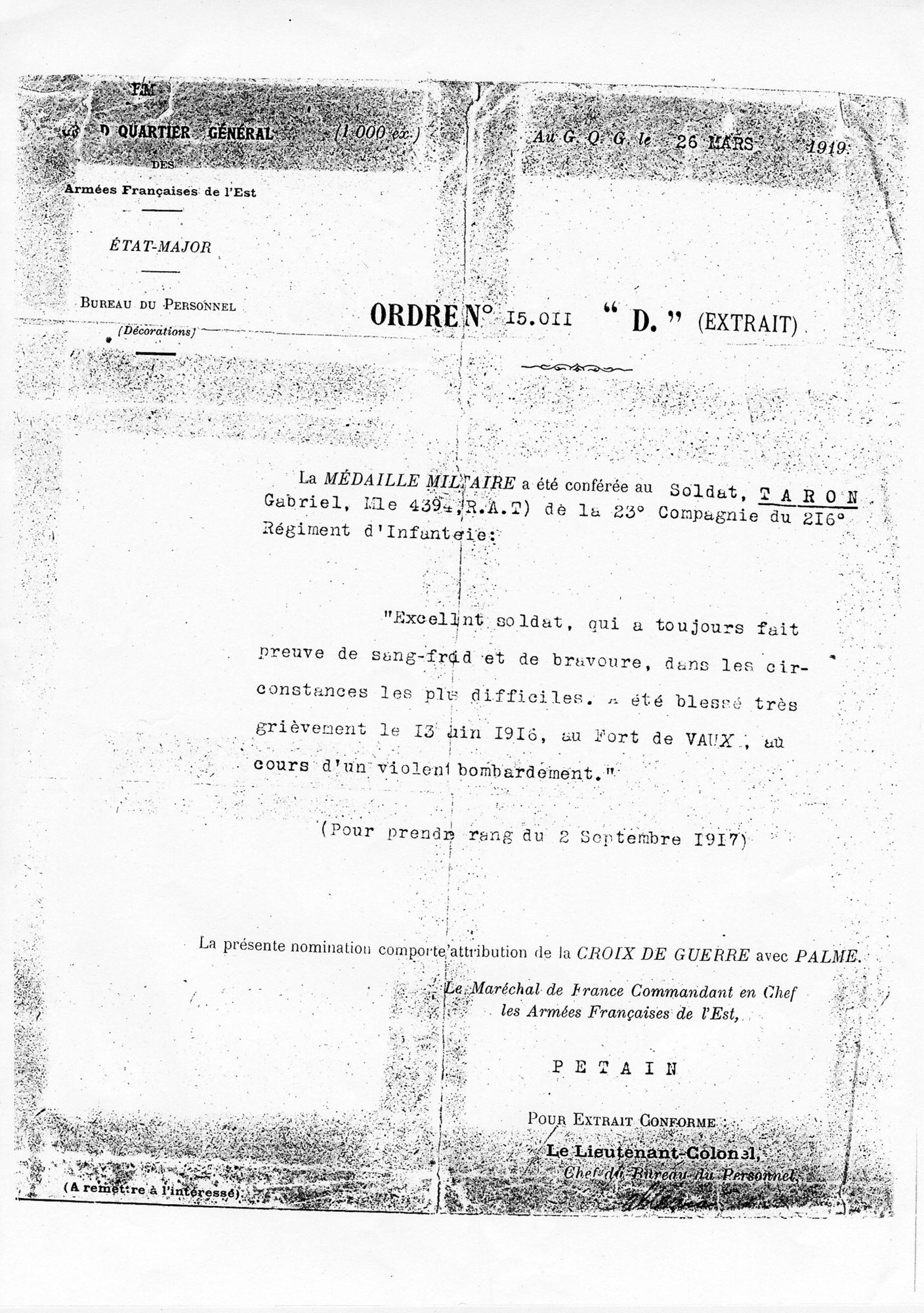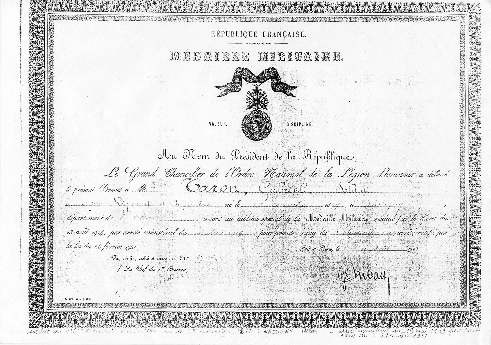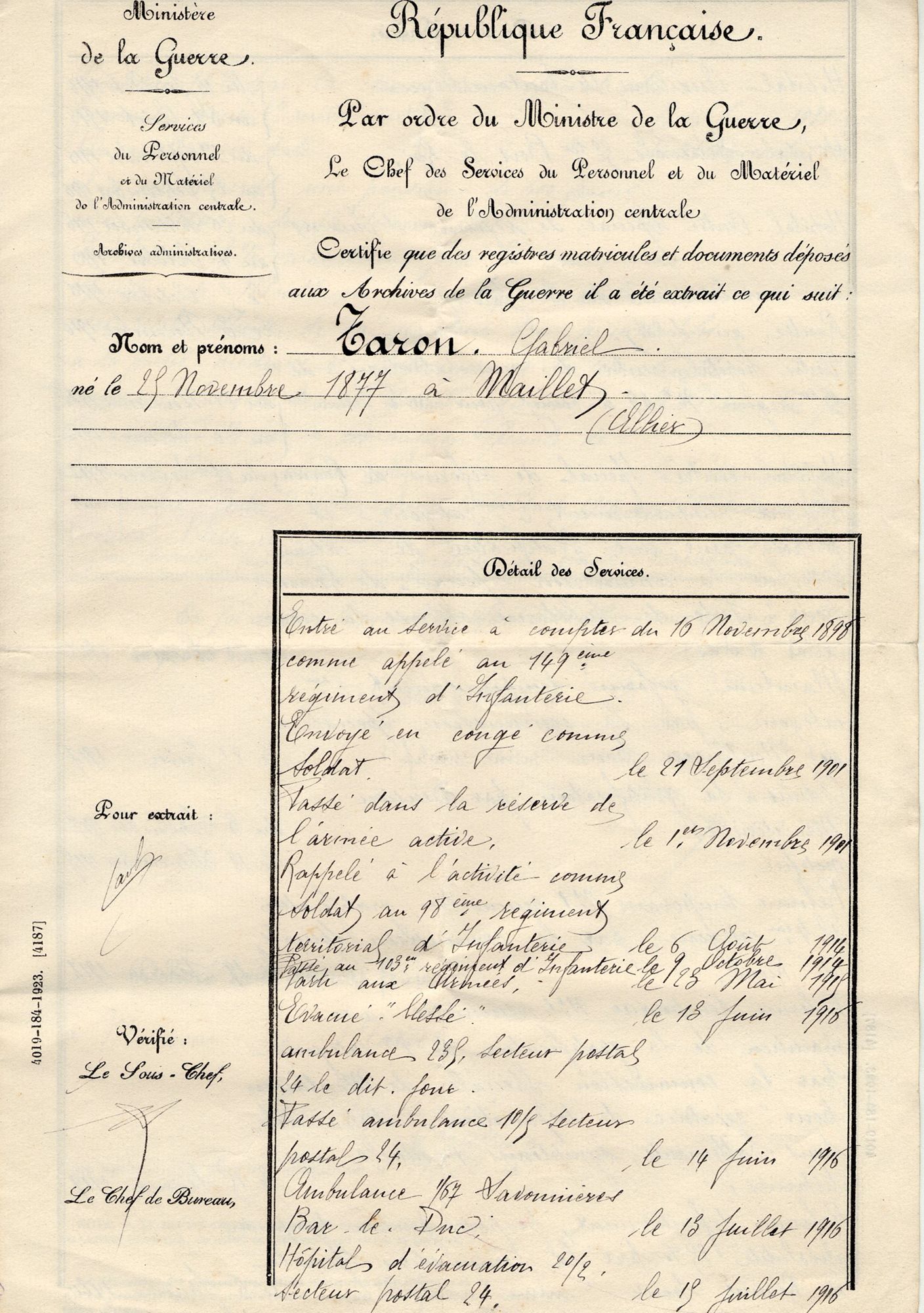 Gabriel Taron (voir photo sur sa carte de combattant) cultivateur né à Maillet, a 37 ans lorsque la guerre éclate en août 1914 (voir son livret militaire). Affecté dans l’infanterie, il est grièvement blessé le 13 juin 1916 au fort de Vaux par éclat d’obus. Il subira une trépanation qui lui laissera outre « une brèche de la grandeur d’une pièce de 2 frcs », selon son registre matricule, et des séquelles type « céphalées, brouillard devant les yeux à l’occasion de la marche et de la fatigue ». Autant de symptômes qui seront décortiqués au moment de l’examen de son dossier de demande de pension d’invalidité. En 1923, il sera finalement reconnu invalide à 35% . Depuis le 2 septembre 1917 il est décoré de la médaille militaire. Il reçoit également la médaille du combattant.