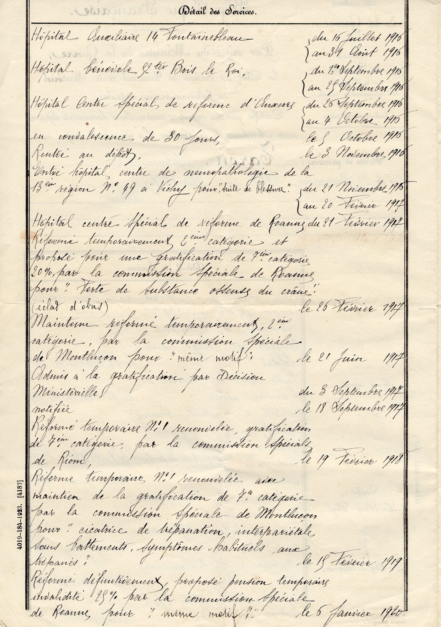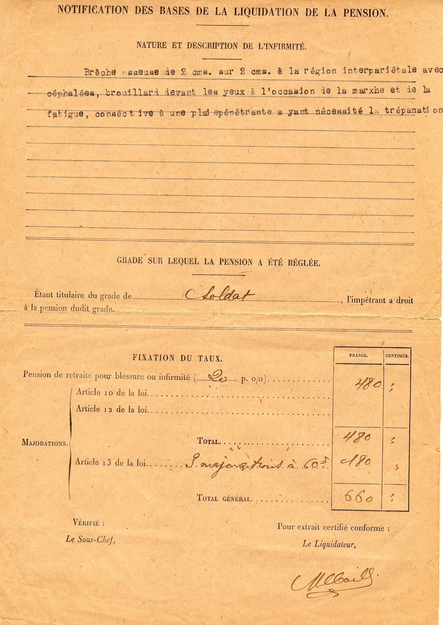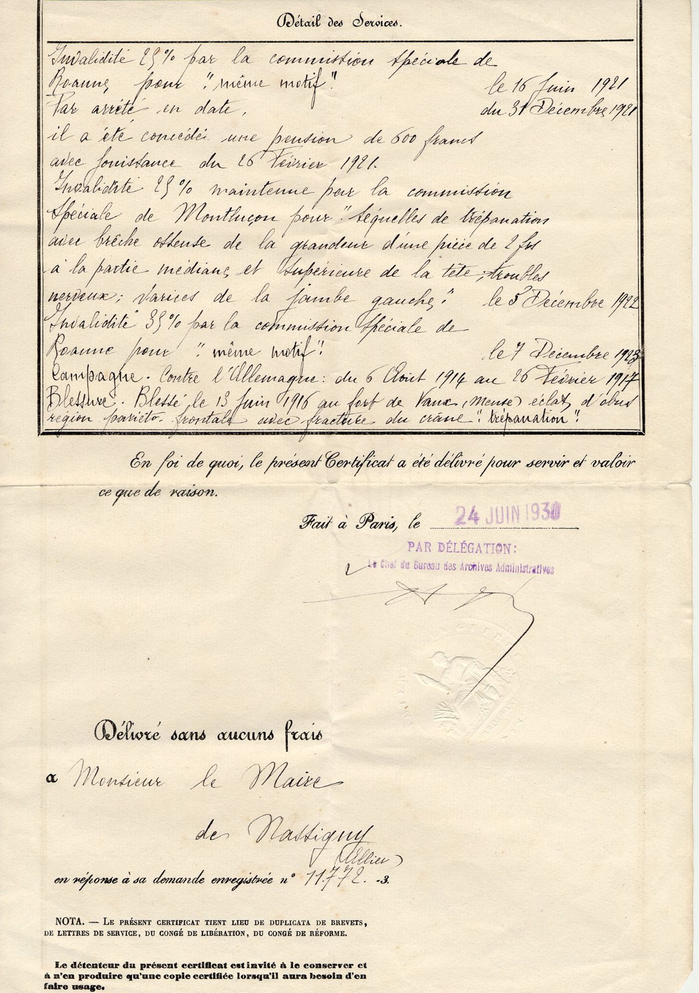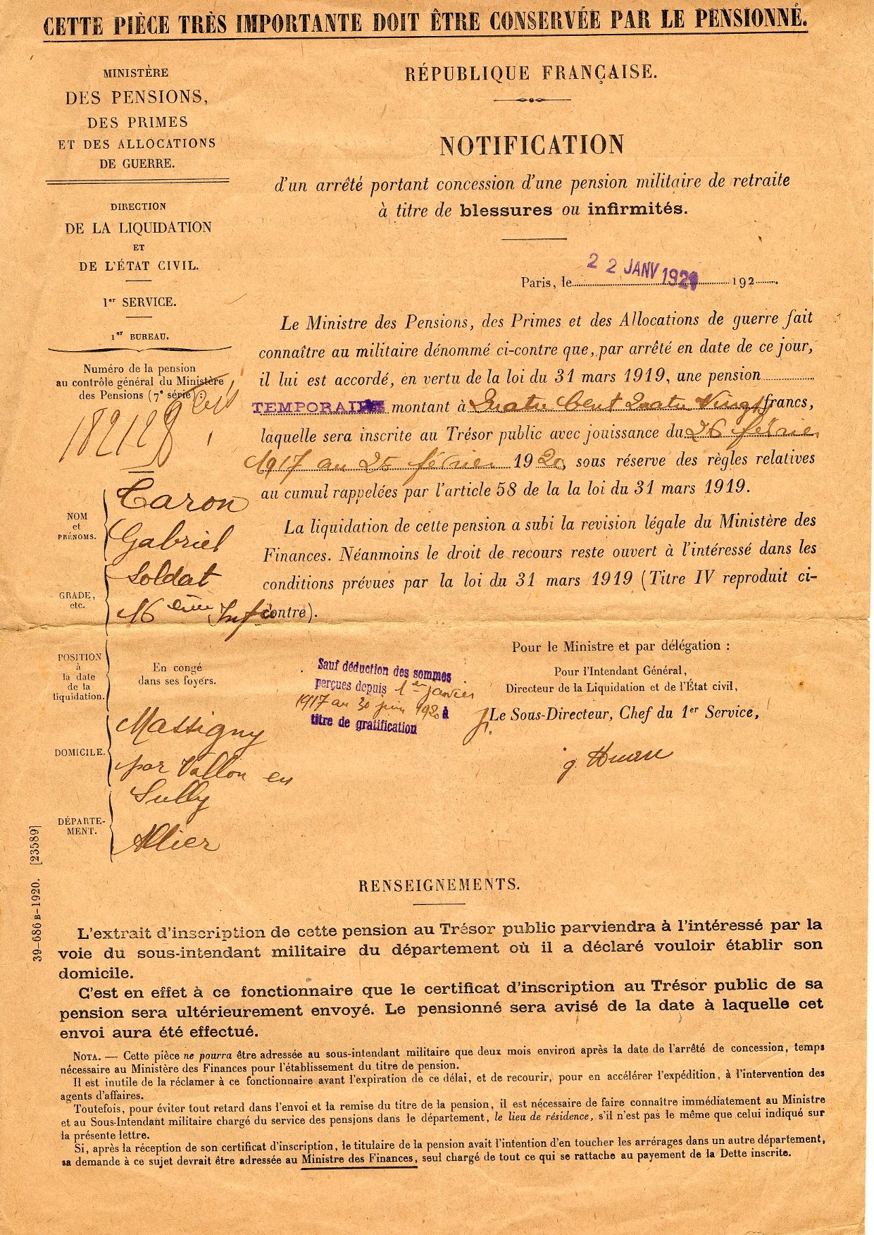 Gabriel Taron (voir photo sur sa carte de combattant) cultivateur né à Maillet, a 37 ans lorsque la guerre éclate en août 1914 (voir son livret militaire). Affecté dans l’infanterie, il est grièvement blessé le 13 juin 1916 au fort de Vaux par éclat d’obus. Il subira une trépanation qui lui laissera outre « une brèche de la grandeur d’une pièce de 2 frcs », selon son registre matricule, et des séquelles type « céphalées, brouillard devant les yeux à l’occasion de la marche et de la fatigue ». Autant de symptômes qui seront décortiqués au moment de l’examen de son dossier de demande de pension d’invalidité. En 1923, il sera finalement reconnu invalide à 35% . Depuis le 2 septembre 1917 il est décoré de la médaille militaire. Il reçoit également la médaille du combattant.